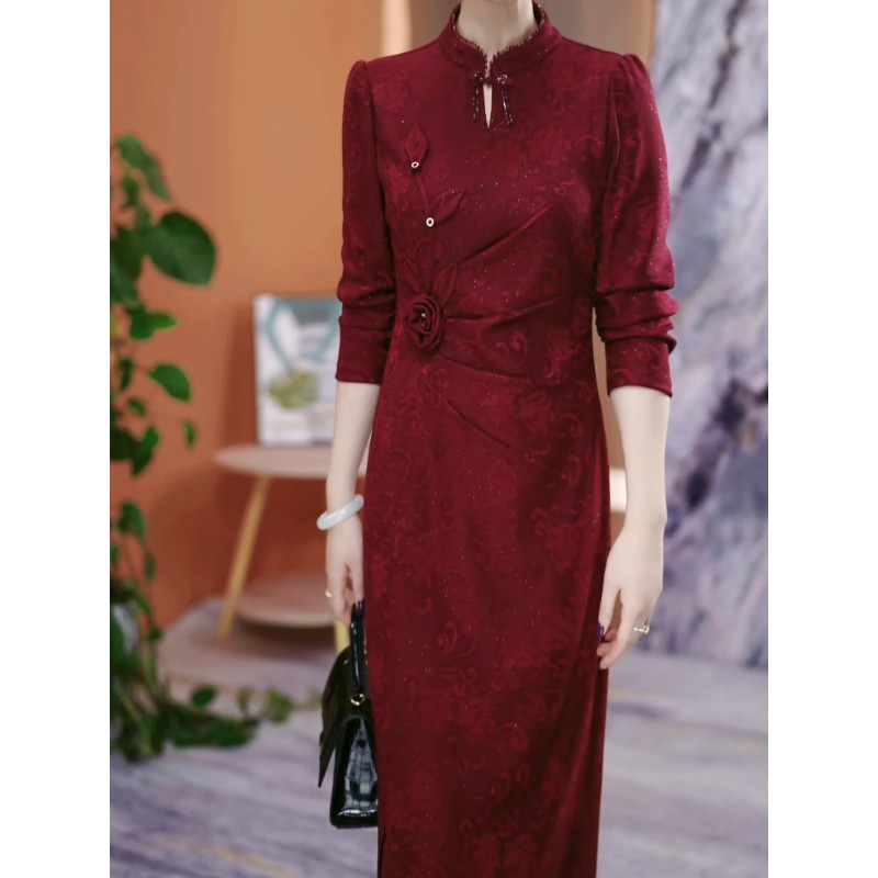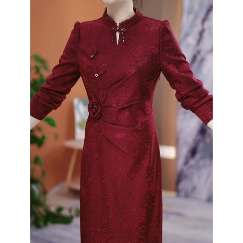中式高端气质复古刺绣连衣裙2025秋冬季新款端庄大气减龄中长裙子