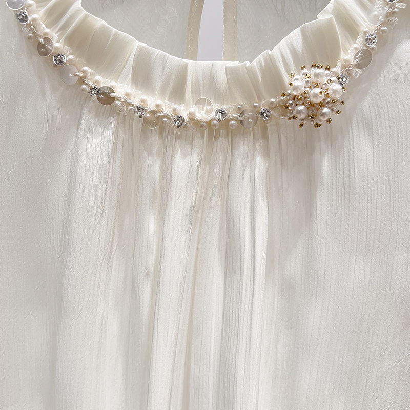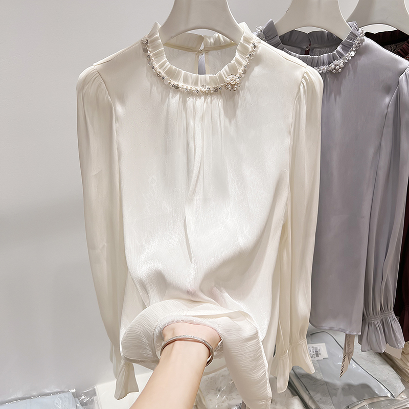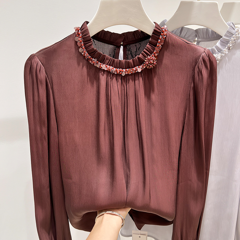 2025新款法式气质立领百褶钉珠纯色套头长袖雪纺衫女秋季薄款上衣
