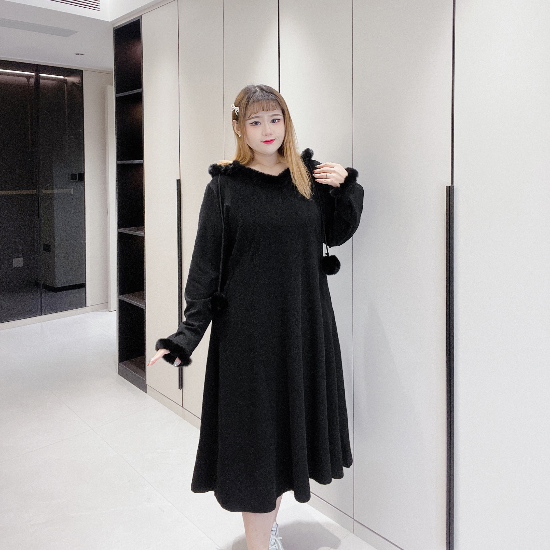 胖莹莹大码女装2025秋冬胖妹加绒毛球慵懒风可爱连帽卫衣裙连衣裙