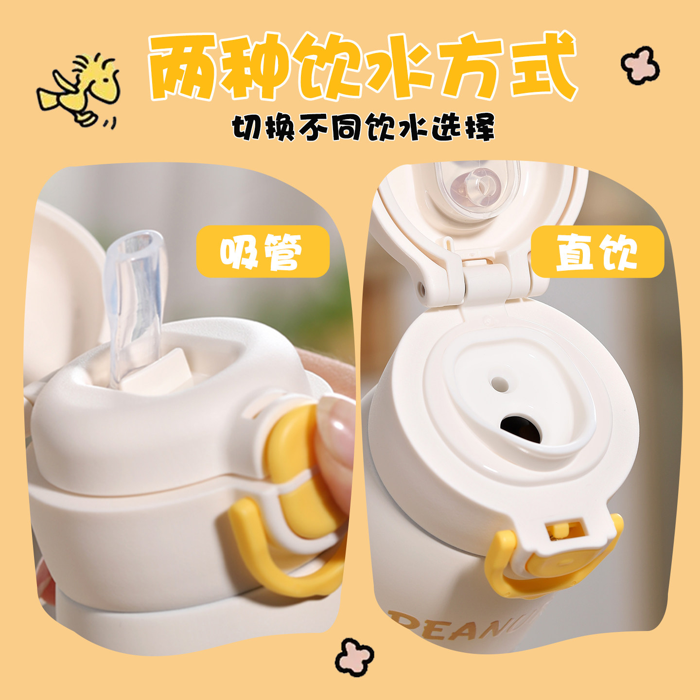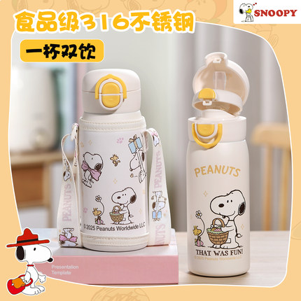 史努比儿童吸管保温杯小学生上学专用幼儿园男女款大容量便携水壶