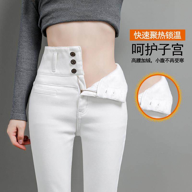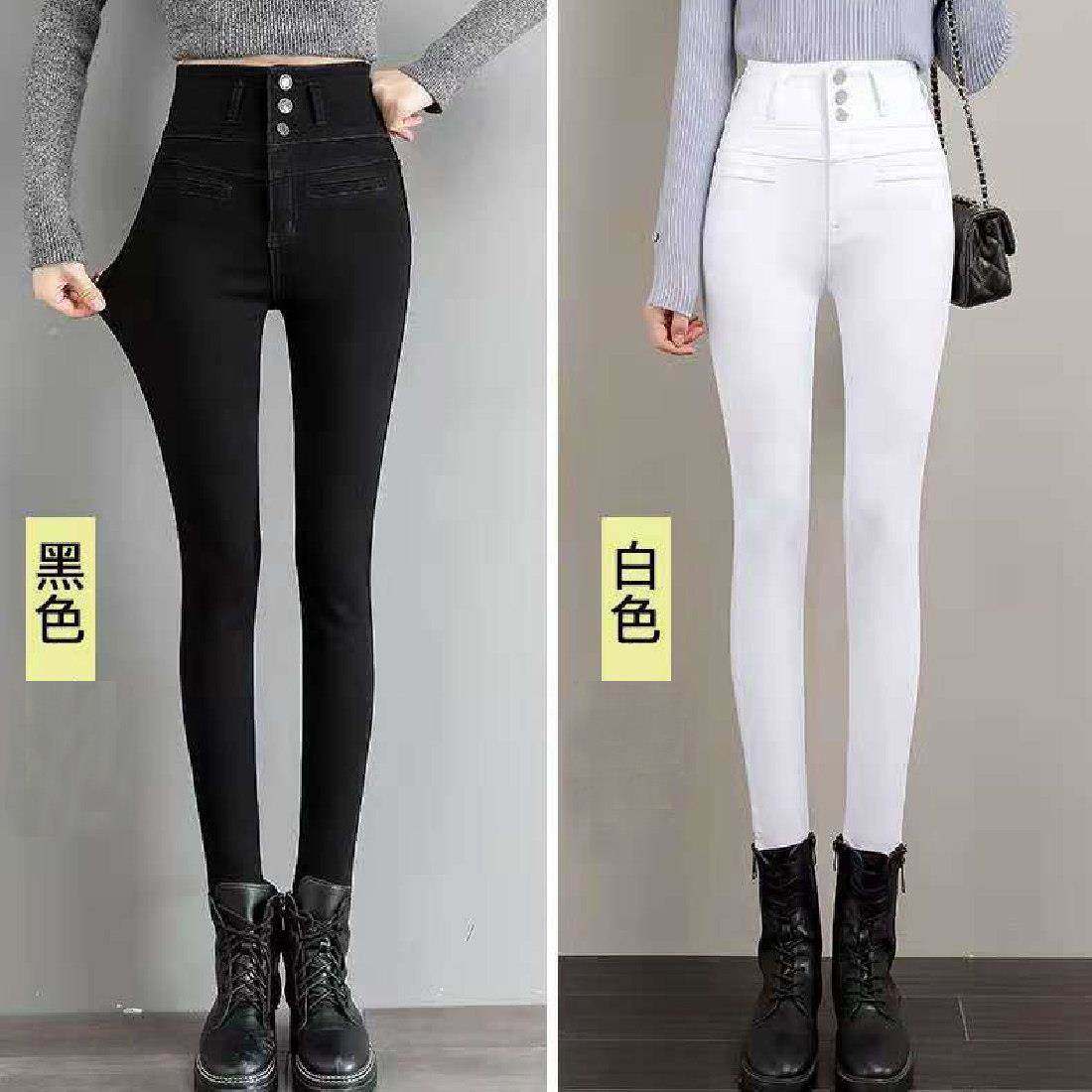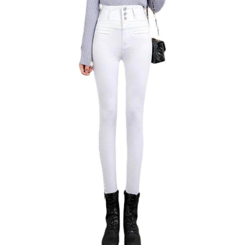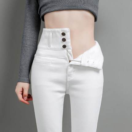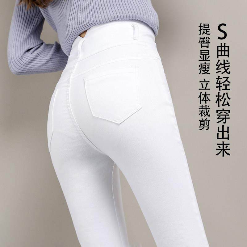 白色超高腰牛仔裤女2025新款春秋弹力紧身小脚女裤排扣铅笔长裤子