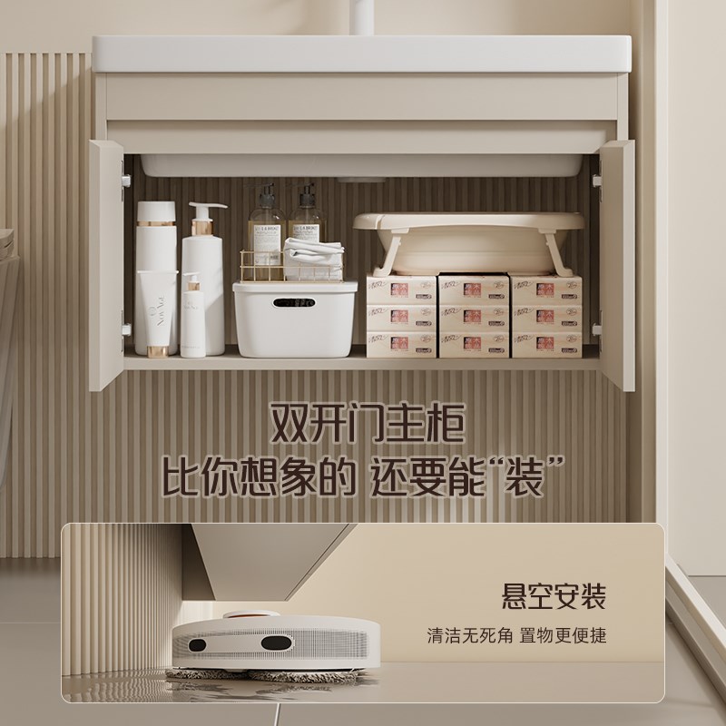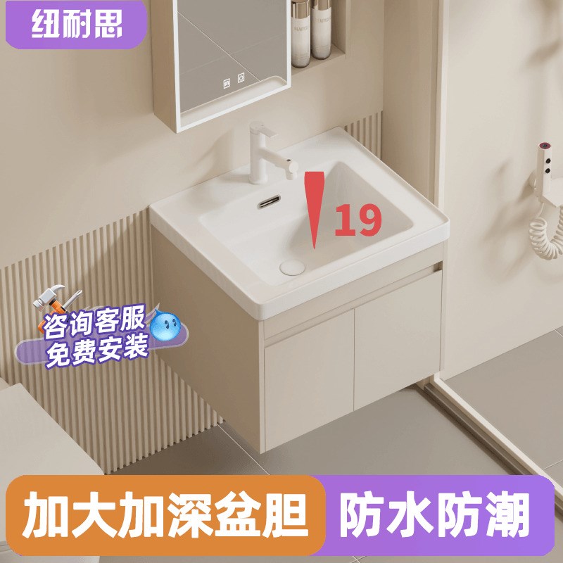纽耐思奶油风浴室柜小户型加深一体盆洗漱台蜂窝铝洗脸盆柜组合60