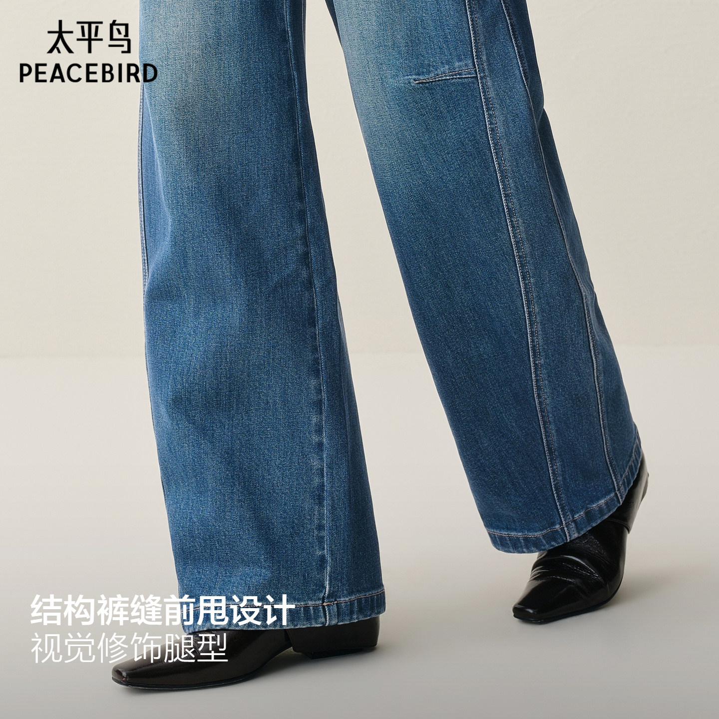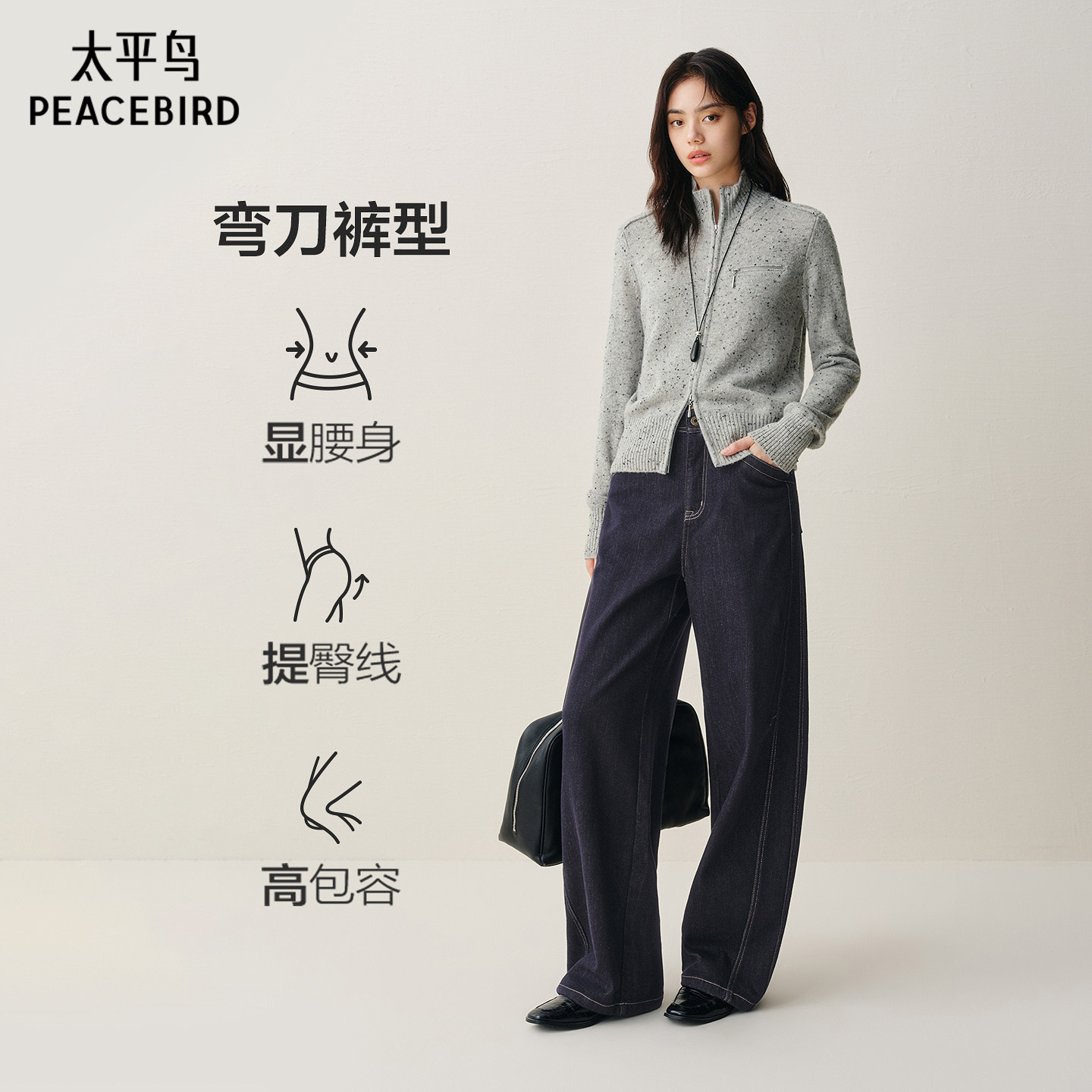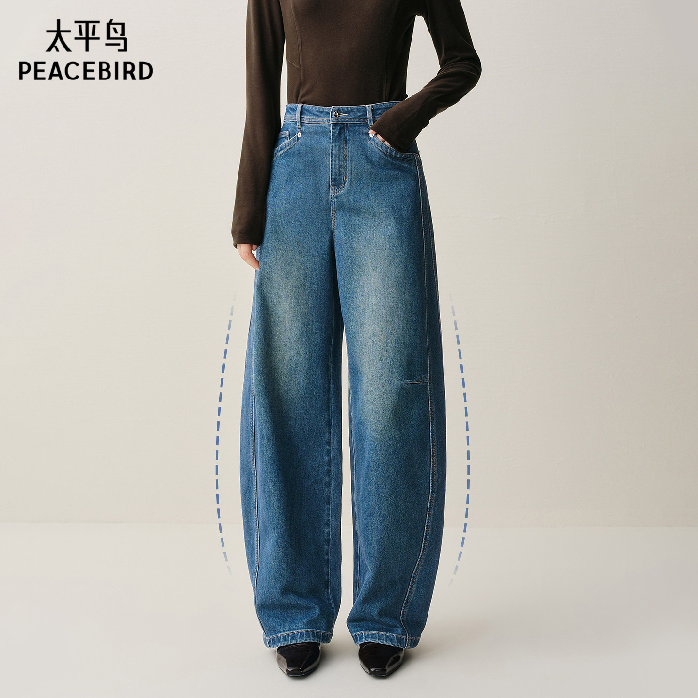 太平鸟高腰磨毛阔腿牛仔裤25年冬季新款宽松保暖茧型弯刀牛仔裤*