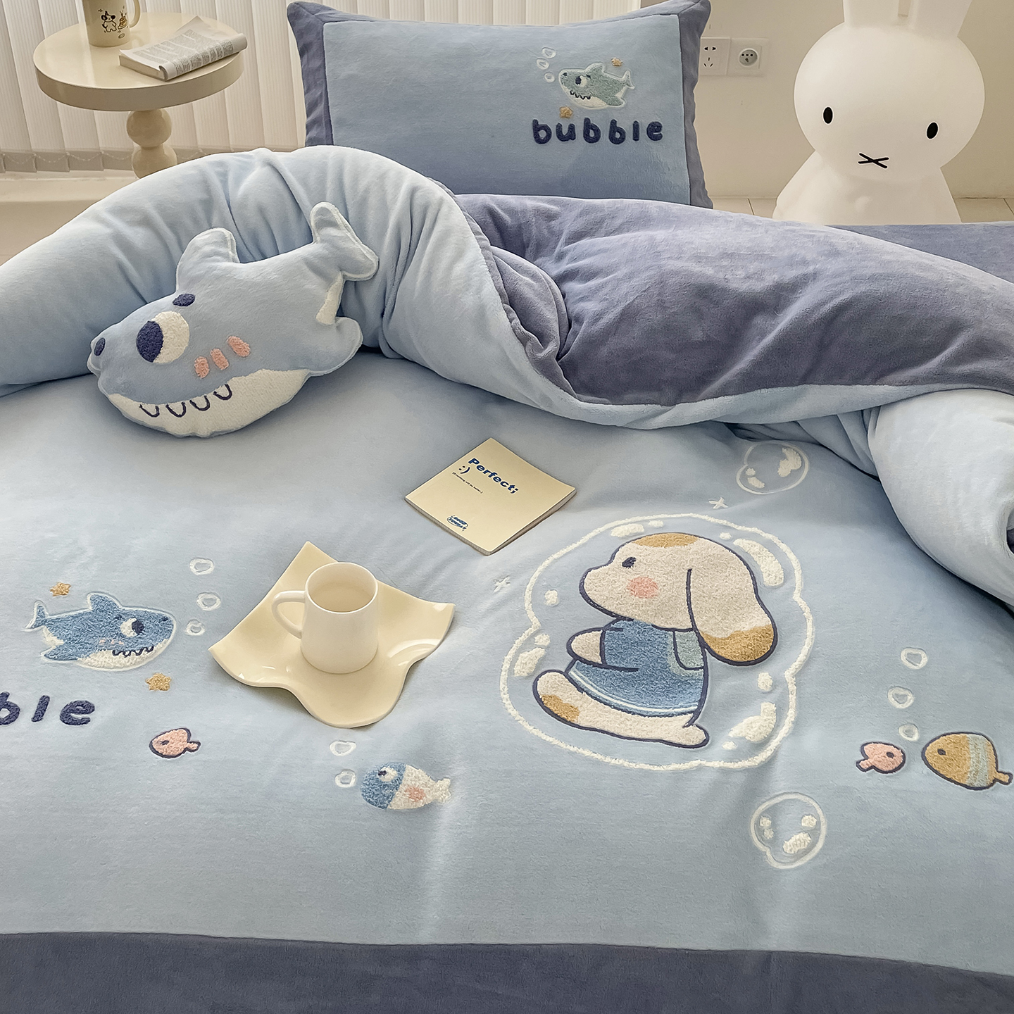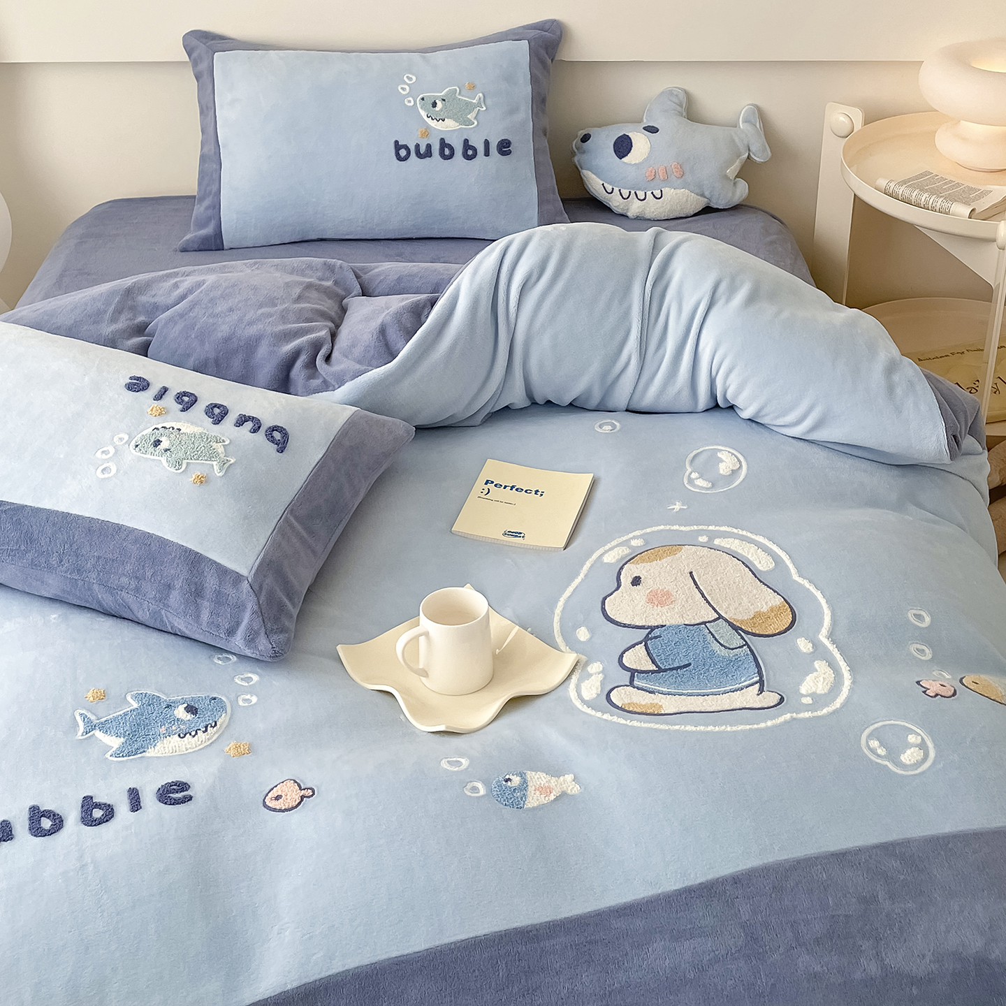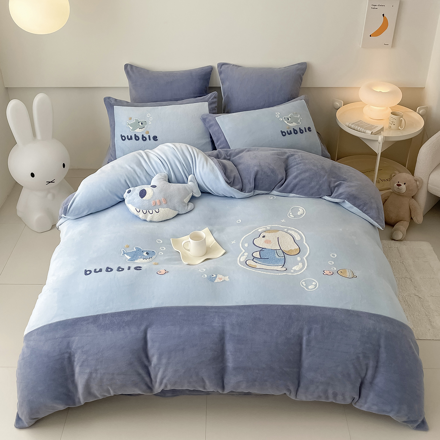 金喜鸟家纺可爱小鲨鱼卡通儿童保暖牛奶绒毛绒四件套冬季男孩床品