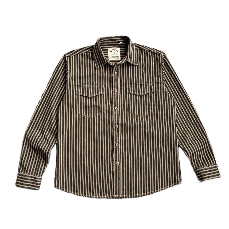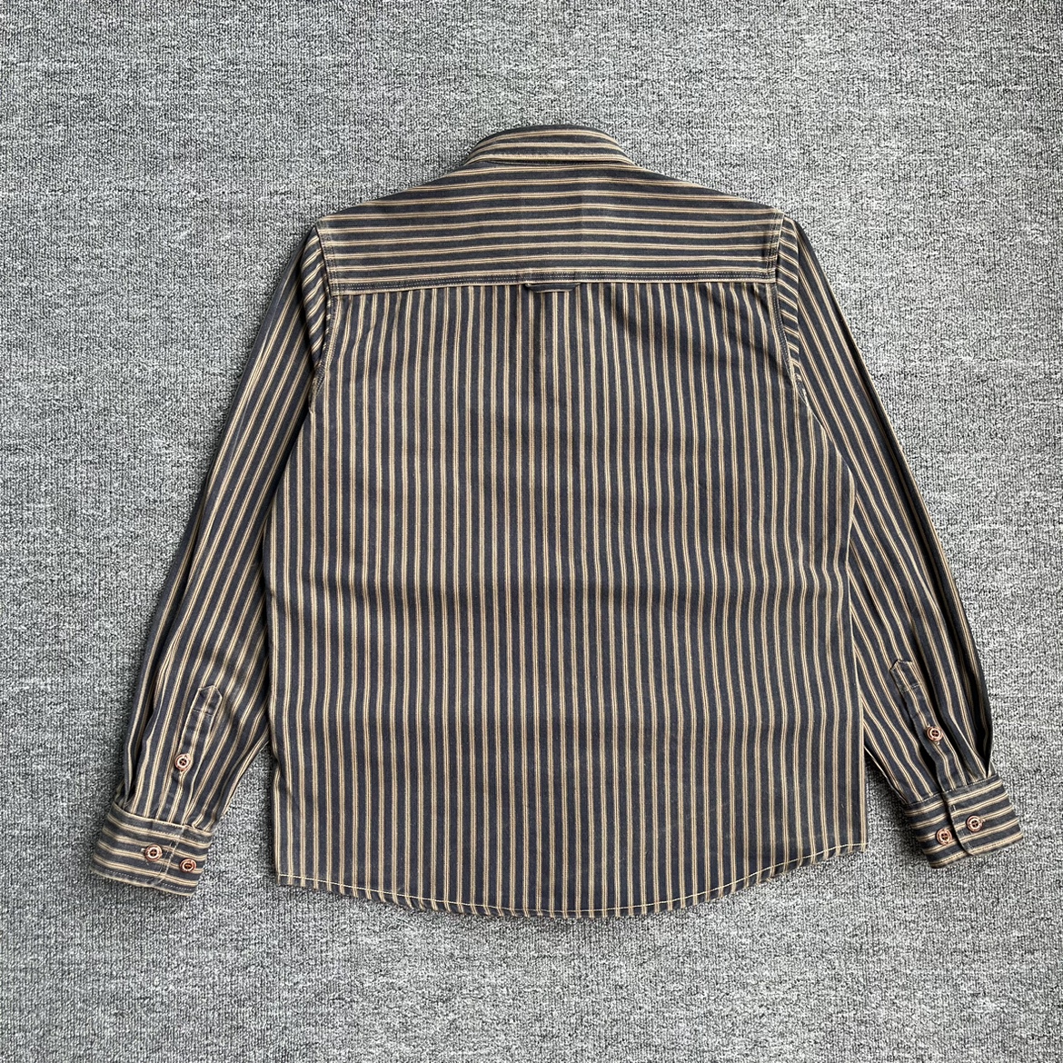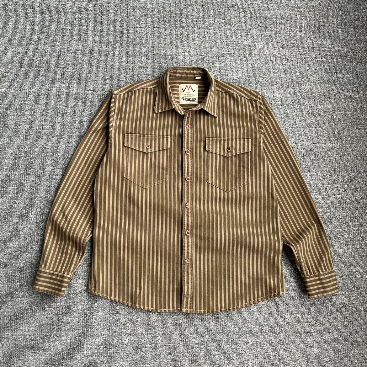 美式休闲复古水洗竖条纹牛仔衬衫纯棉阿美咔叽工装做旧长袖衬衣男