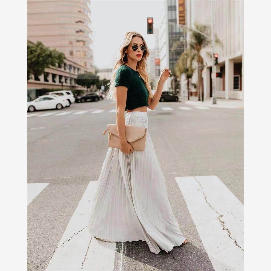 欧洲站波西米亚风时尚粉色百褶度假沙滩大摆半身裙舞蹈长裙S-2XL