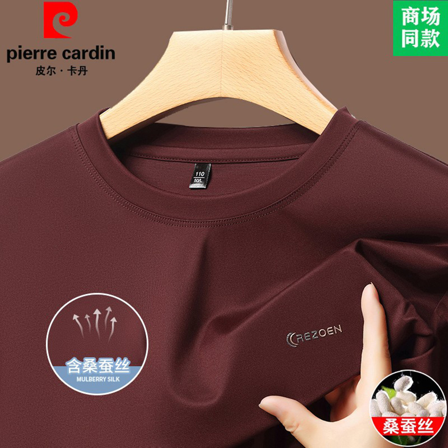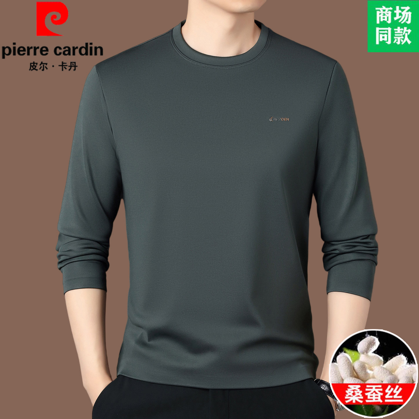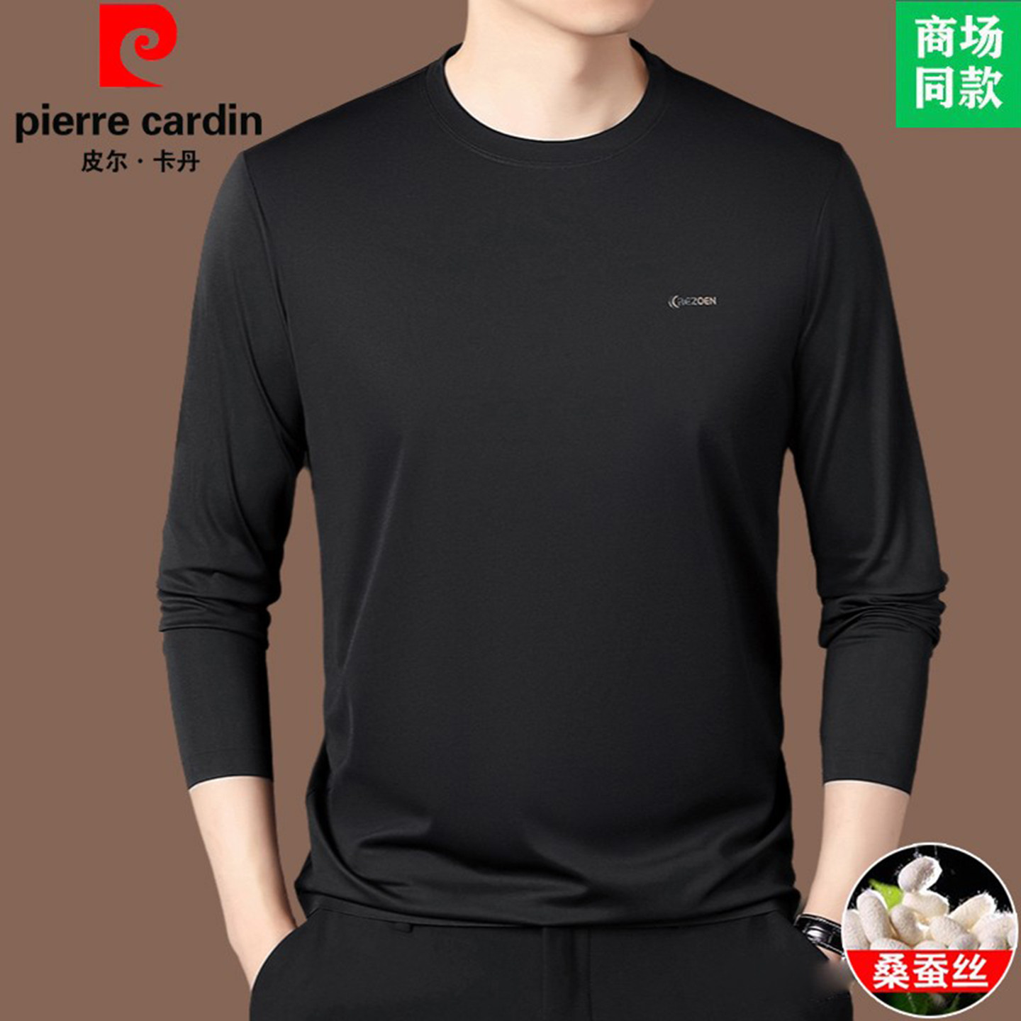 皮尔卡丹高端桑蚕丝长袖t恤男中年圆领爸爸装春秋大码上衣打底衫