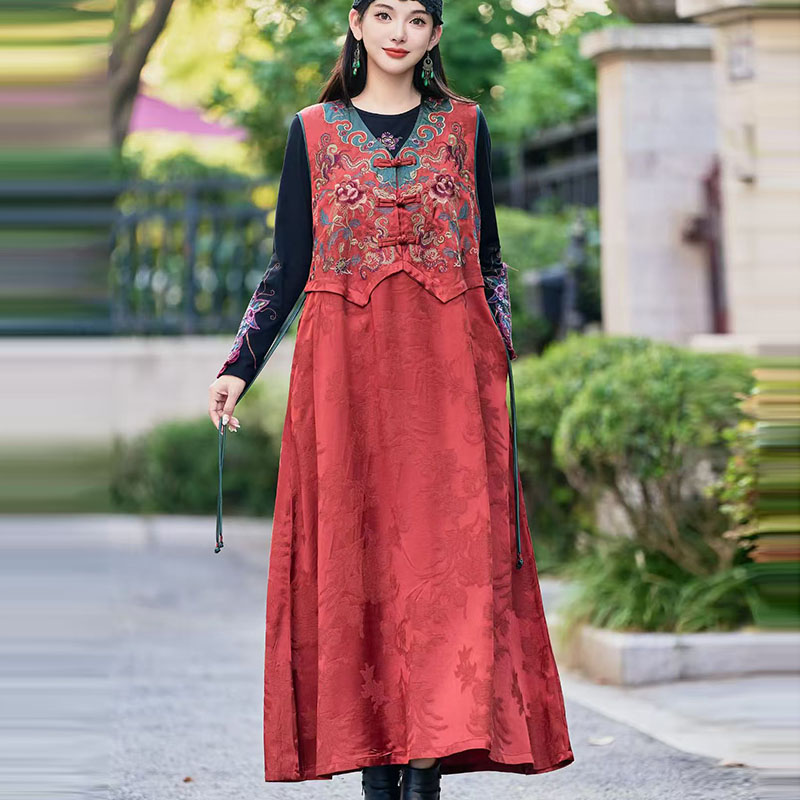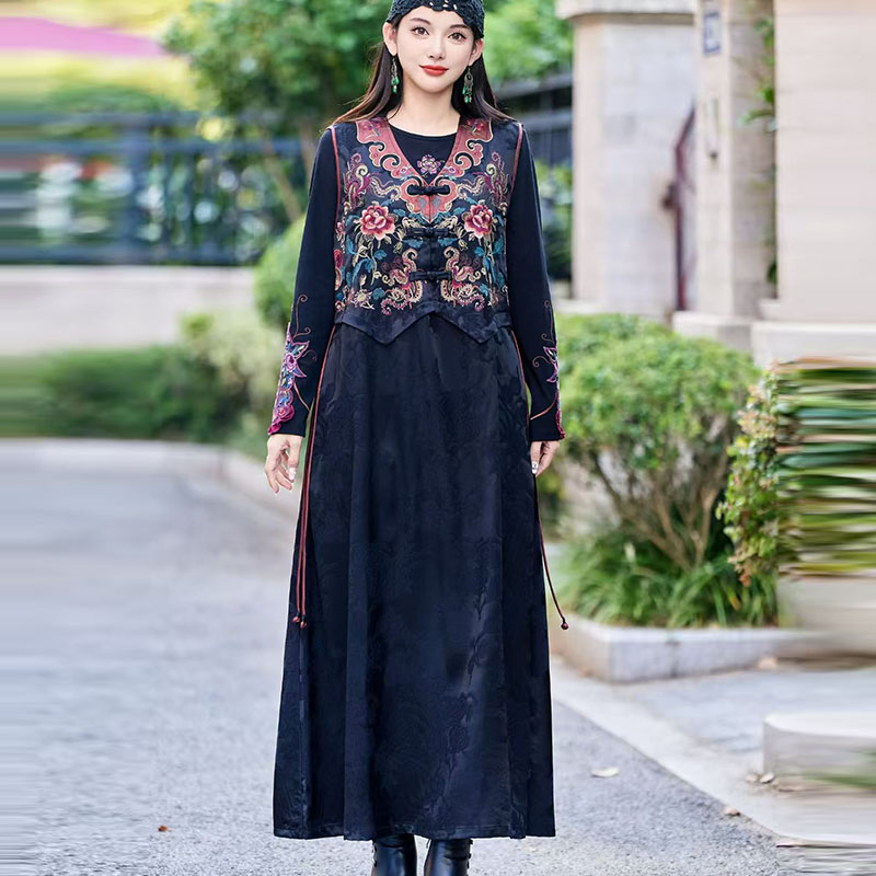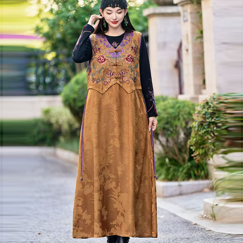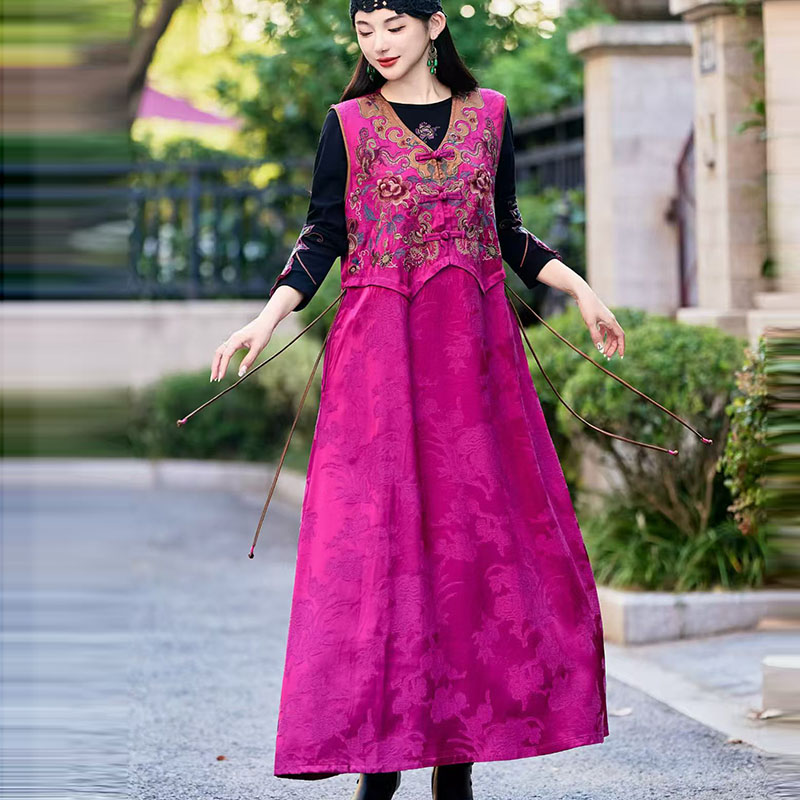 2025年新款重工刺绣民族风背心马甲裙复古V领盘扣无袖长款连衣裙