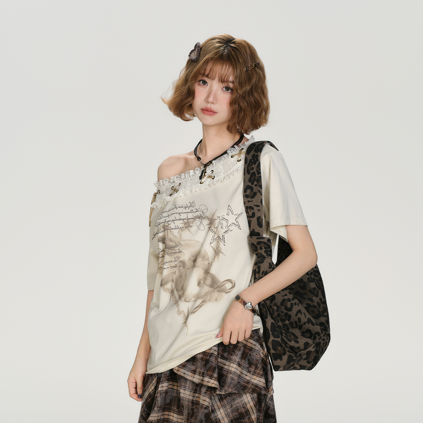 Girlyhalo美式复古蕾丝花边短袖t恤女夏季新款设计感宽松显瘦上衣