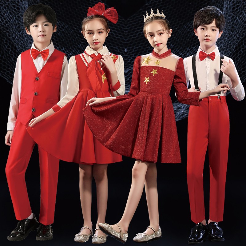 六一儿童大合唱团演出服红色主题男女童红歌红星朗诵歌唱祖国表演