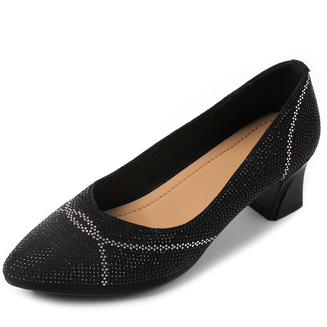 中跟浅口单鞋女2025春季新款尖头粗跟水钻小皮鞋百搭气质软底女鞋
