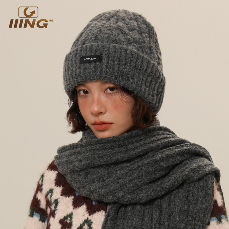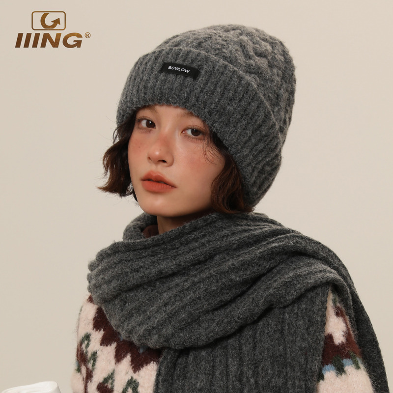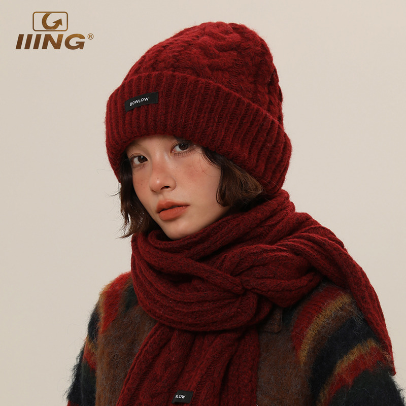 羊毛针织帽女冬季保暖护耳显脸小红色卷边毛线帽子围巾围脖两件套