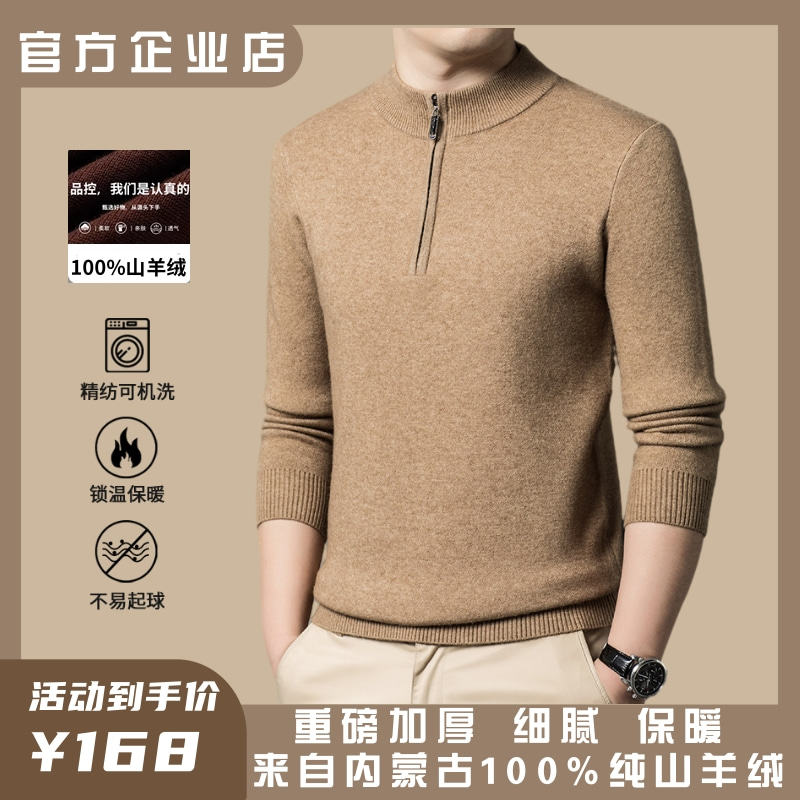 鄂尔多斯市产100%纯山羊绒男士毛衣半高拉链纯色羊绒针织打底衫男