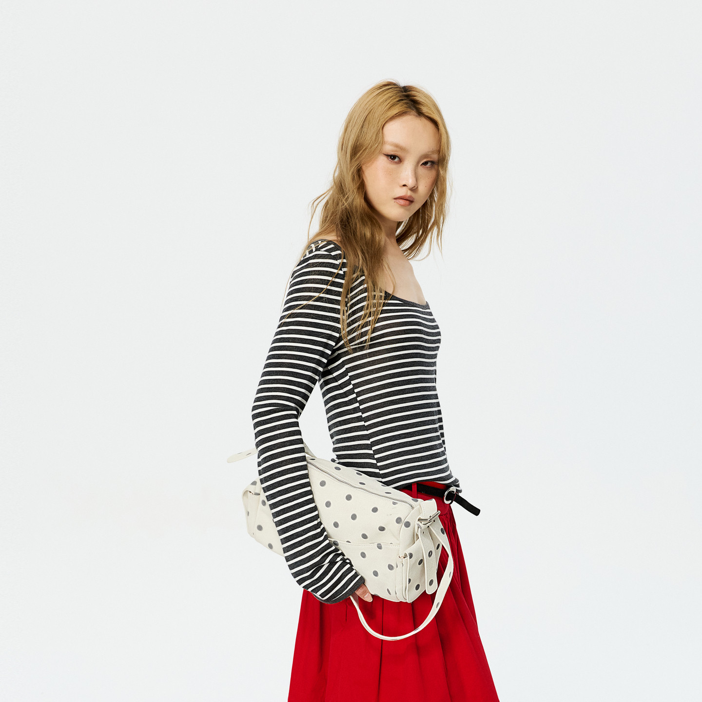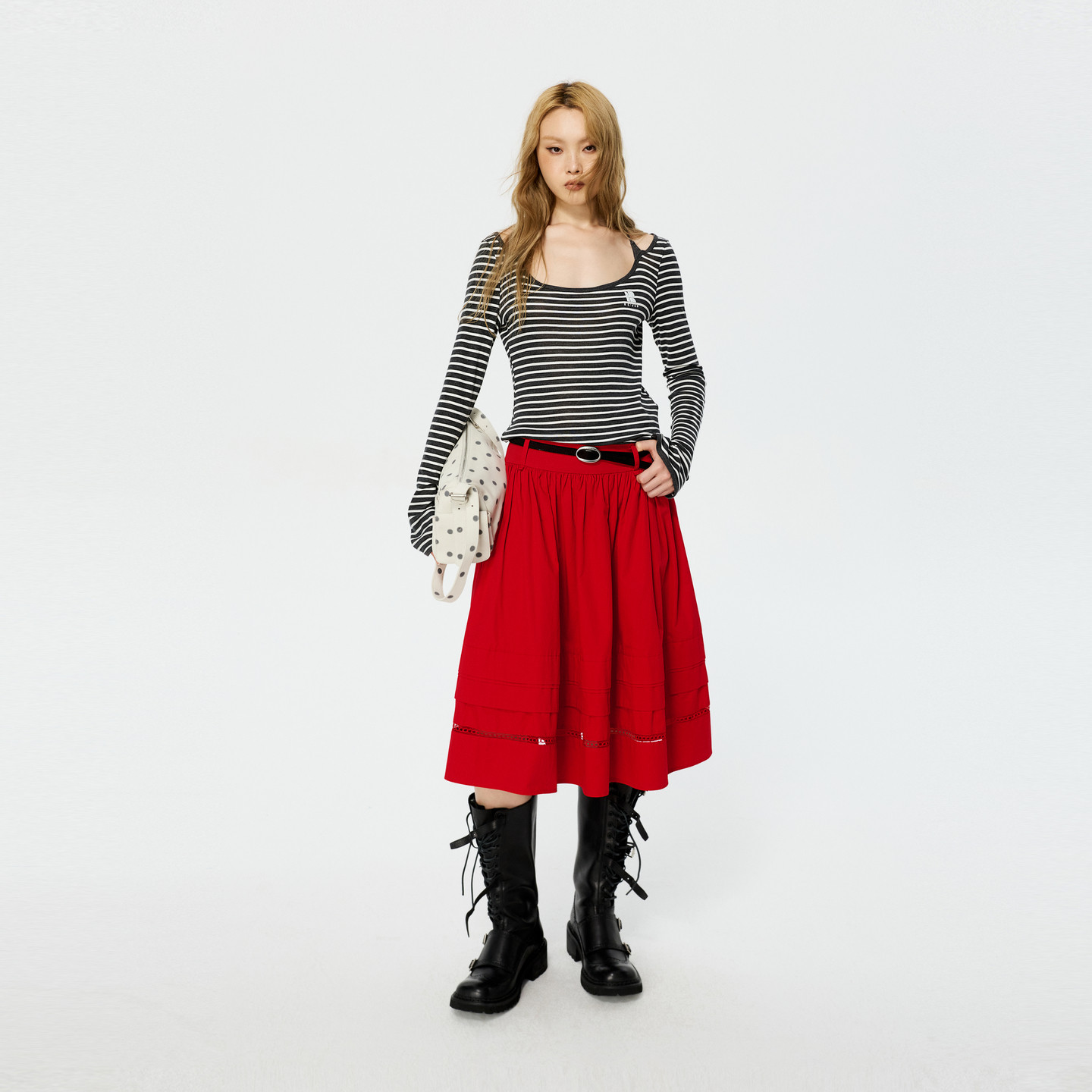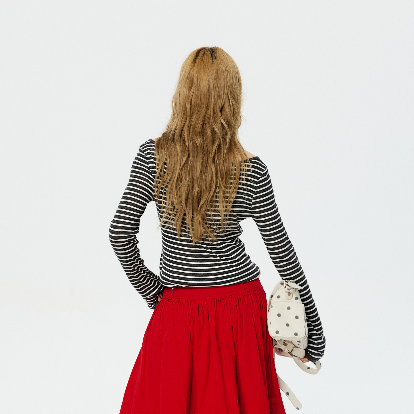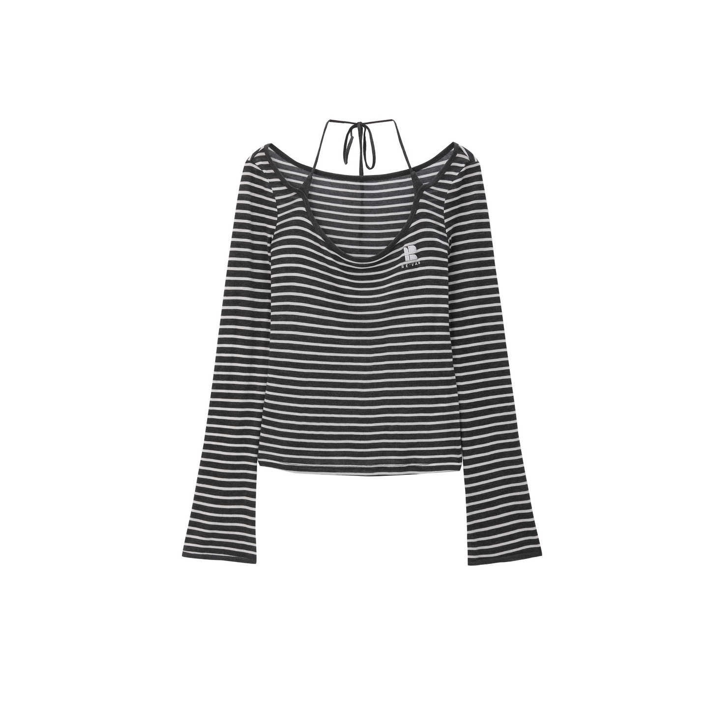 REVAN芮范设计师款三角绑带喇叭袖U型领黑灰条纹T恤RK10801093