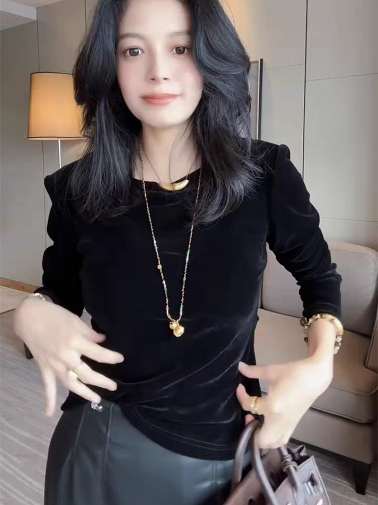 欧货设计美背蕾丝上衣女2025秋新款圆领修身长袖气质丝绒T恤小衫
