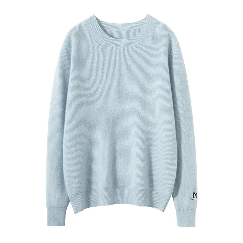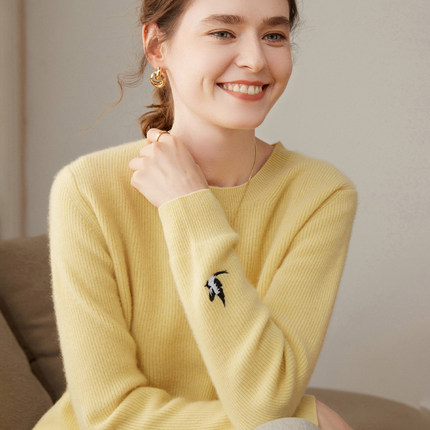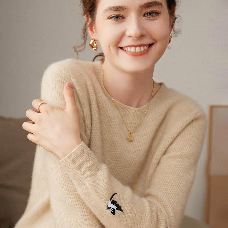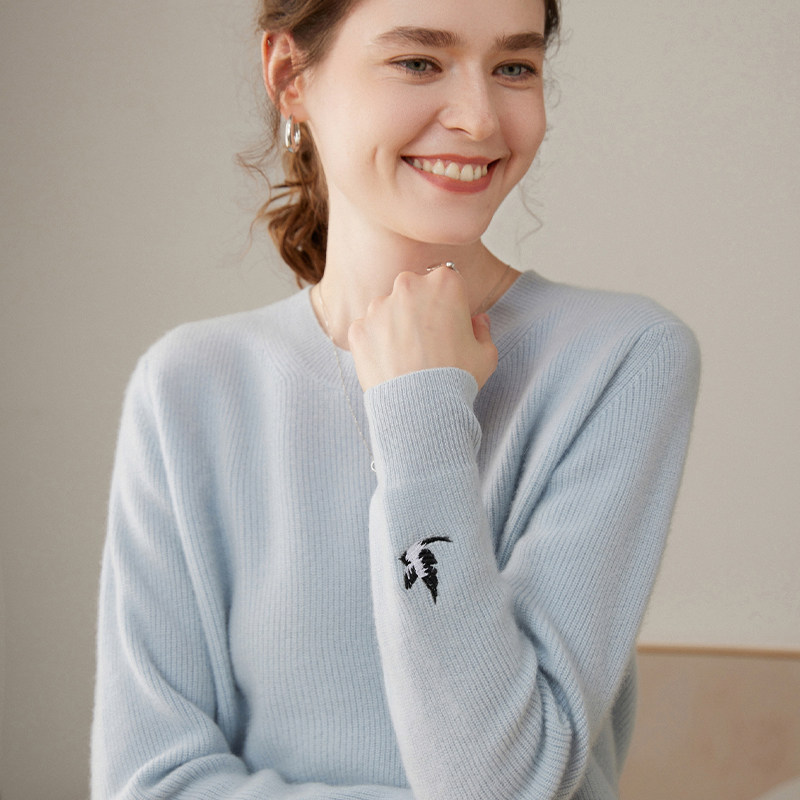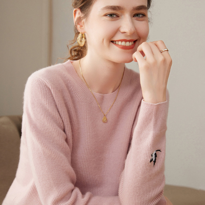 圆领100%纯山羊绒衫女秋冬新款毛衣加厚刺绣上衣高级宽松针织打底