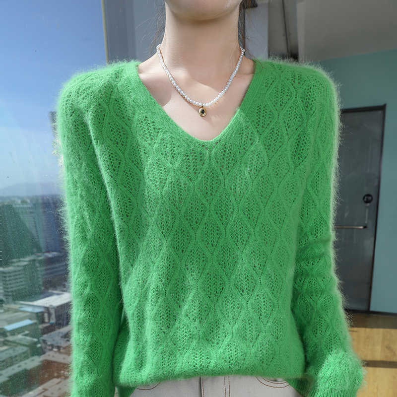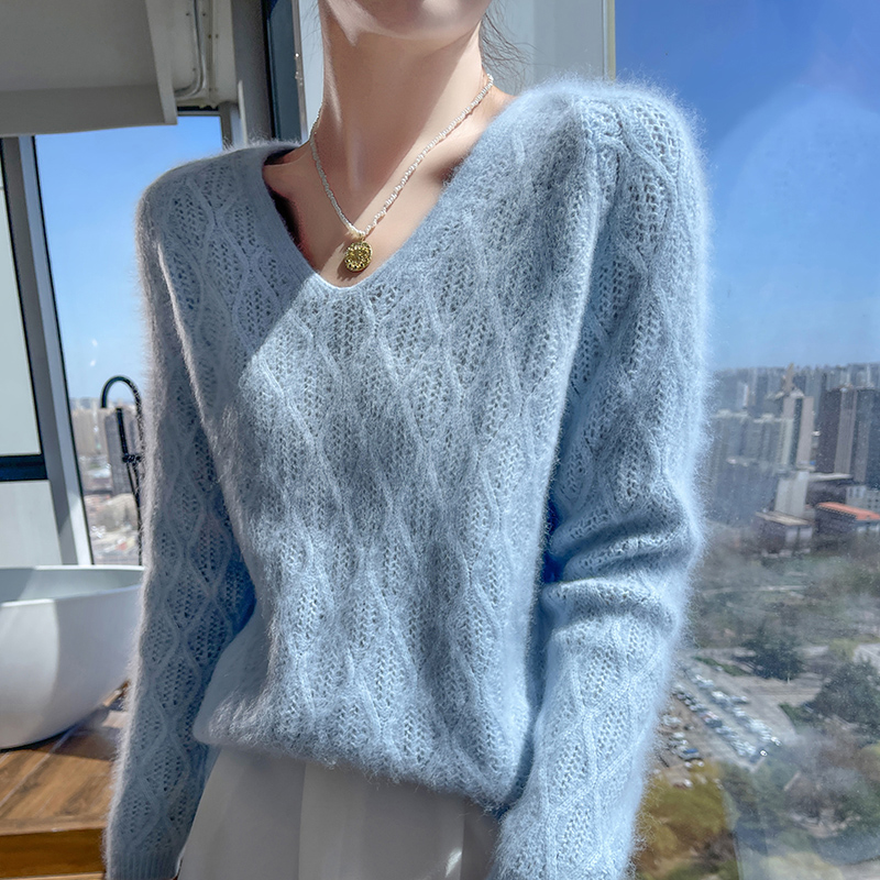 貂绒毛衣女宽松v领羊绒衫镂空羊毛针织打底衫慵懒风外穿加厚纯色