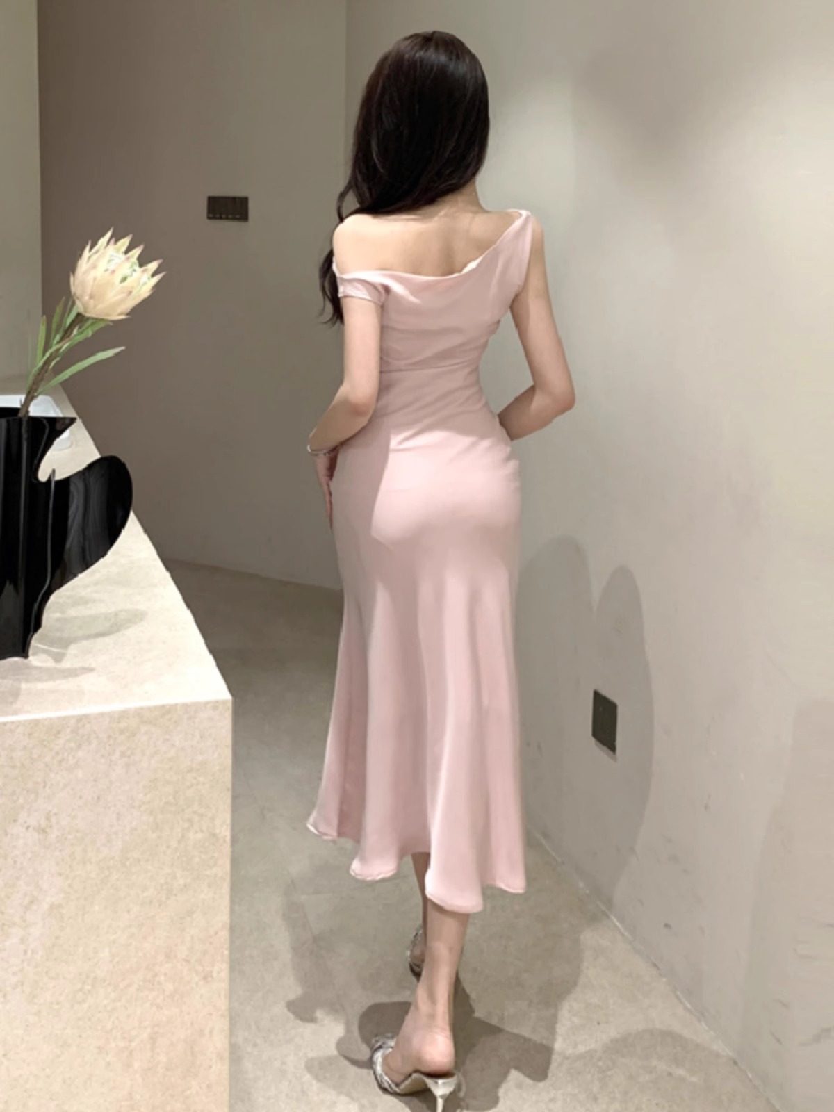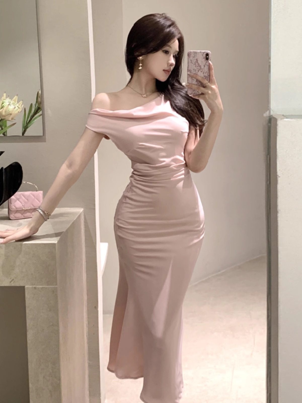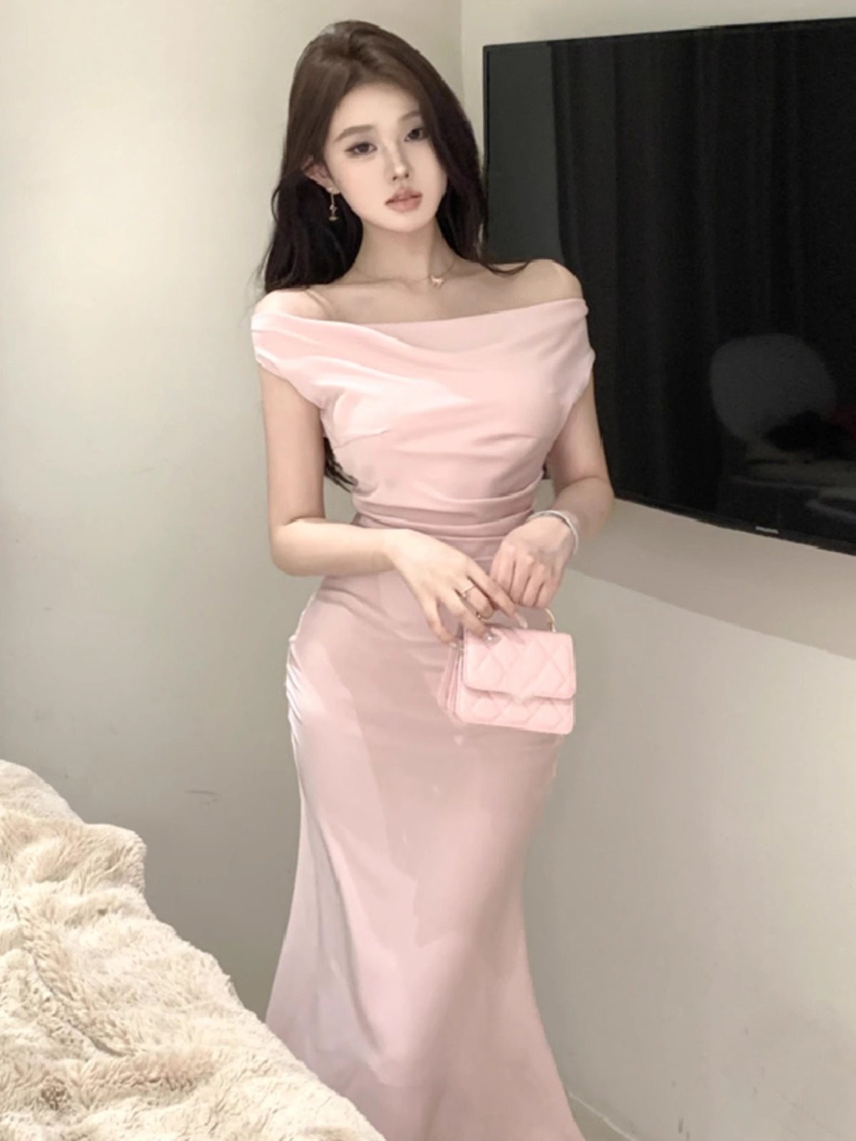 法式气质御姐性感斜肩缎面荡领连衣裙女夏季高级感鱼尾晚礼服长裙