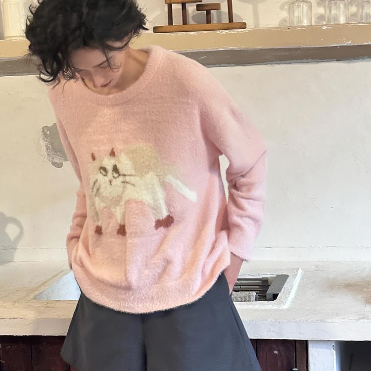 peur童趣手绘猫咪提花图粉色毛衣亲肤羽毛纱圆领套头宽松原创甜美