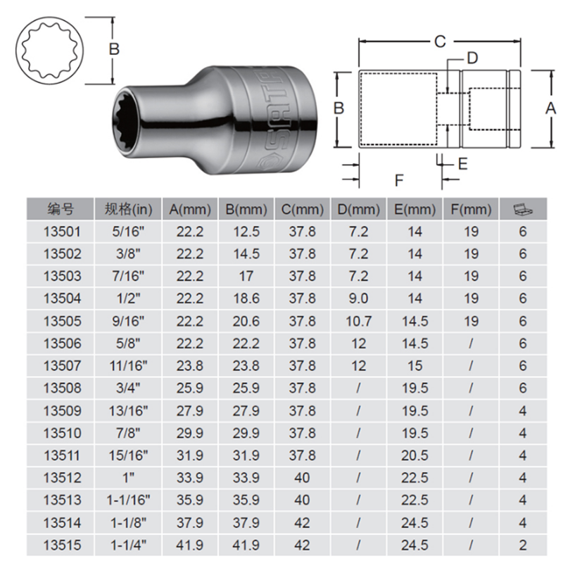 世达工具12.5mm系列大飞1/2寸英制12角套筒头子13501/13505/13506