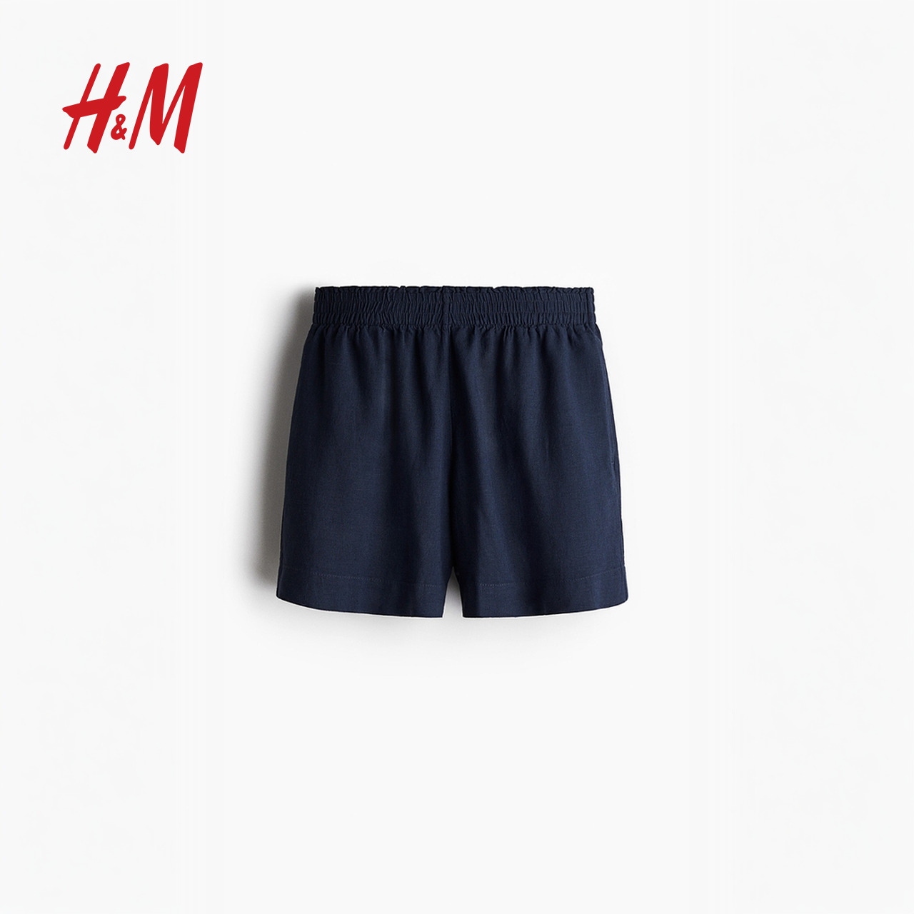 HM女装休闲裤2025夏季新款通勤松紧腰直筒亚麻混纺短裤1259175