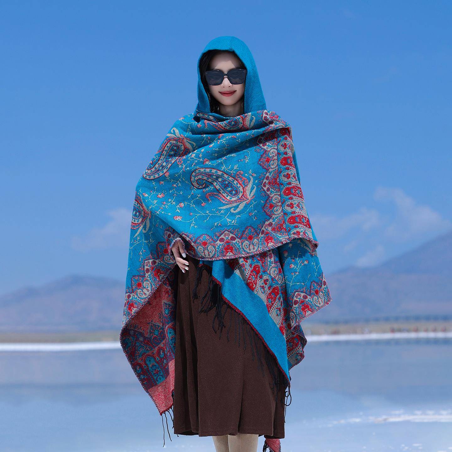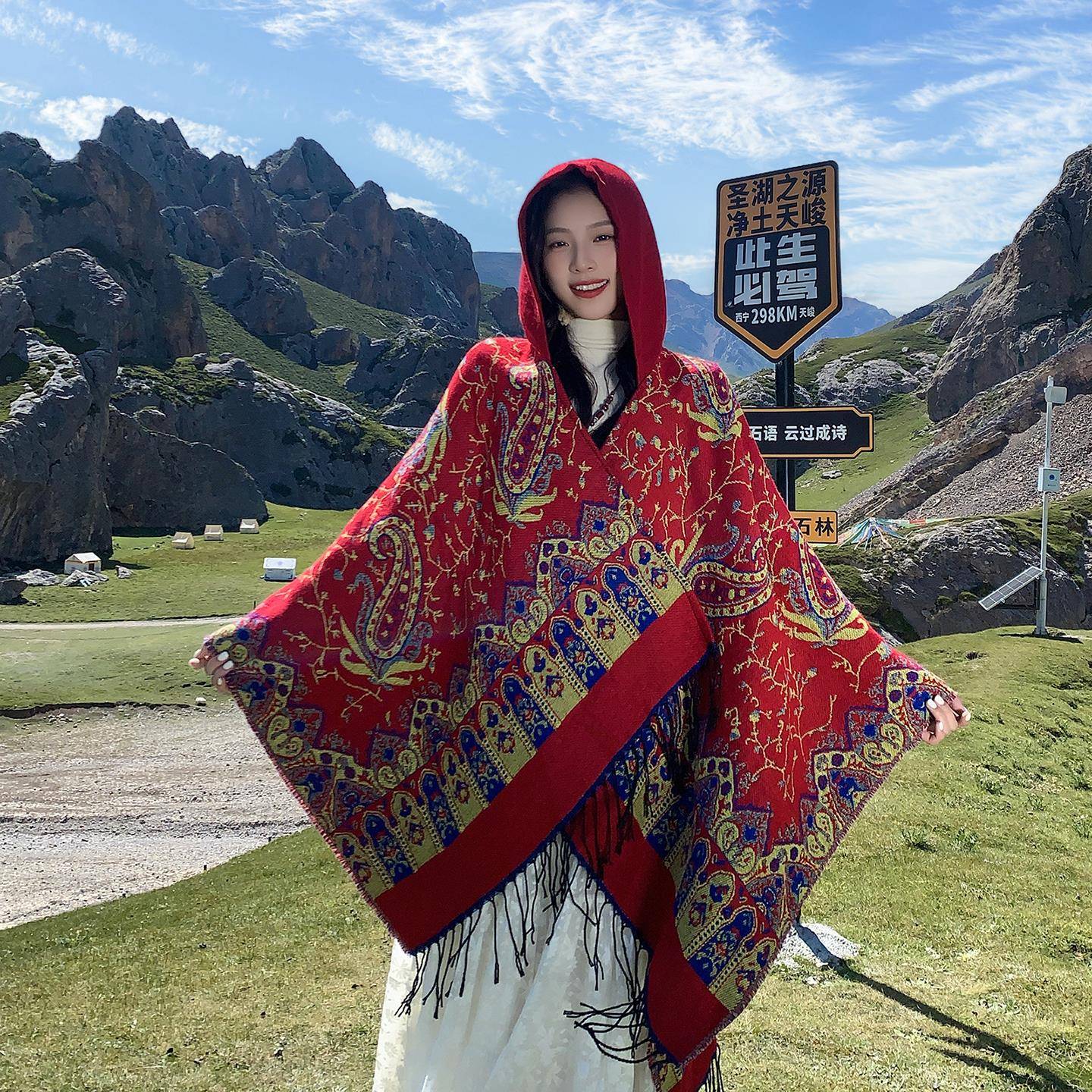 秋冬洋气百搭女士围巾披肩旅游民族风带帽子斗篷季加厚保暖1010c