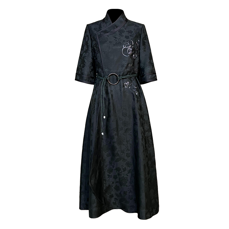 中国风短袖桑蚕丝舒适气质精致刺绣香云纱中长款百搭连衣裙女夏季