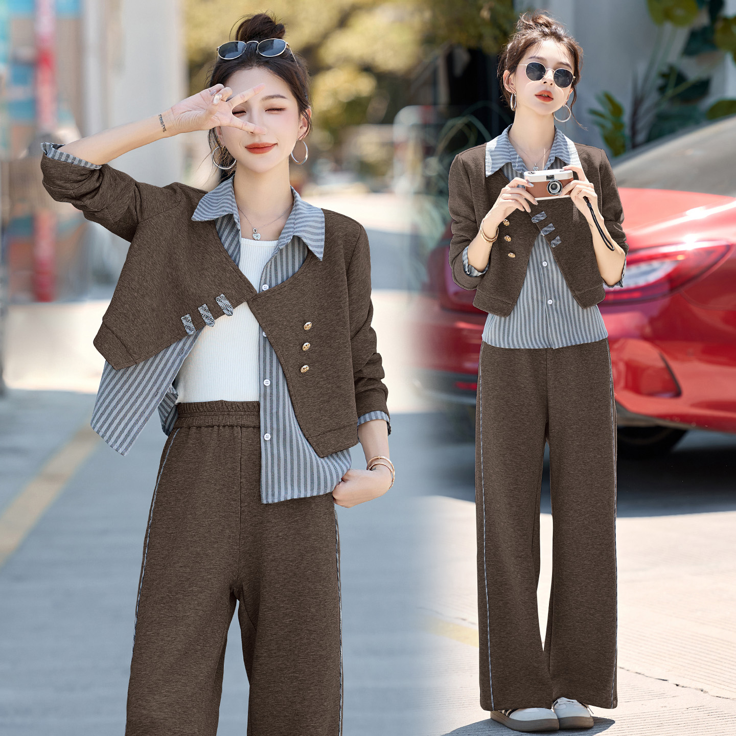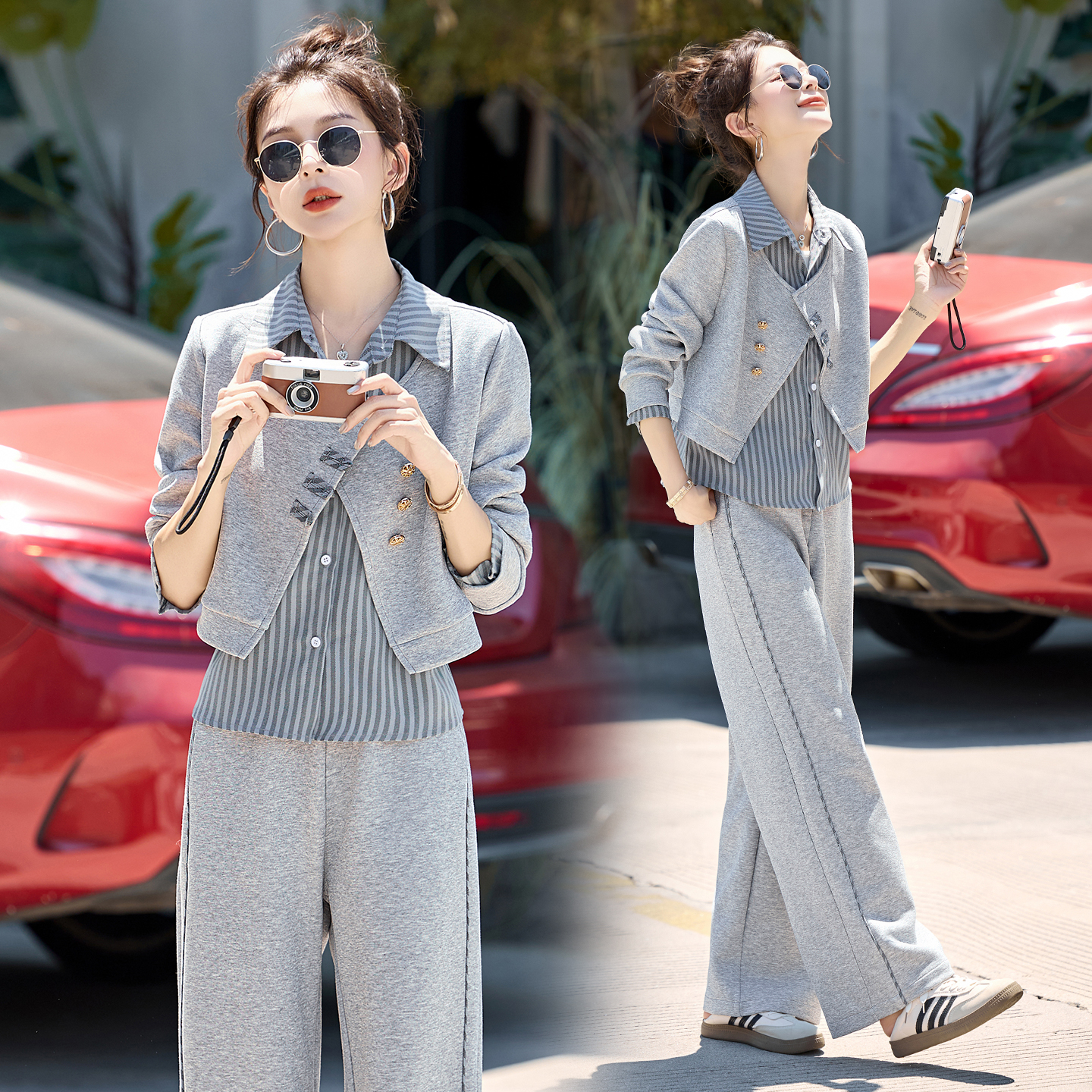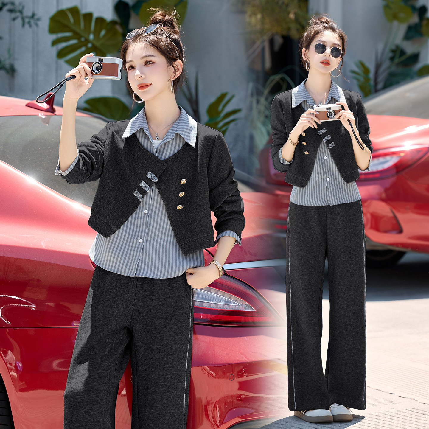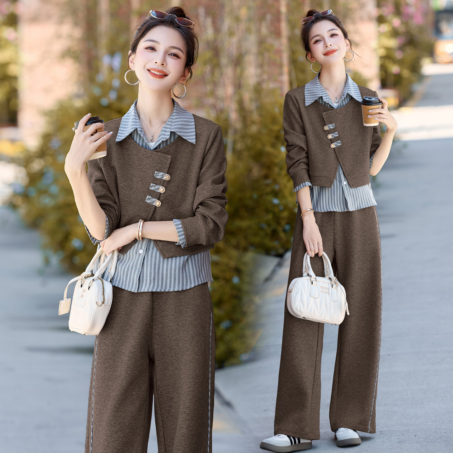 设计感条纹衬衫拼接套装女2025春秋新款休闲时尚宽松阔腿裤两件套