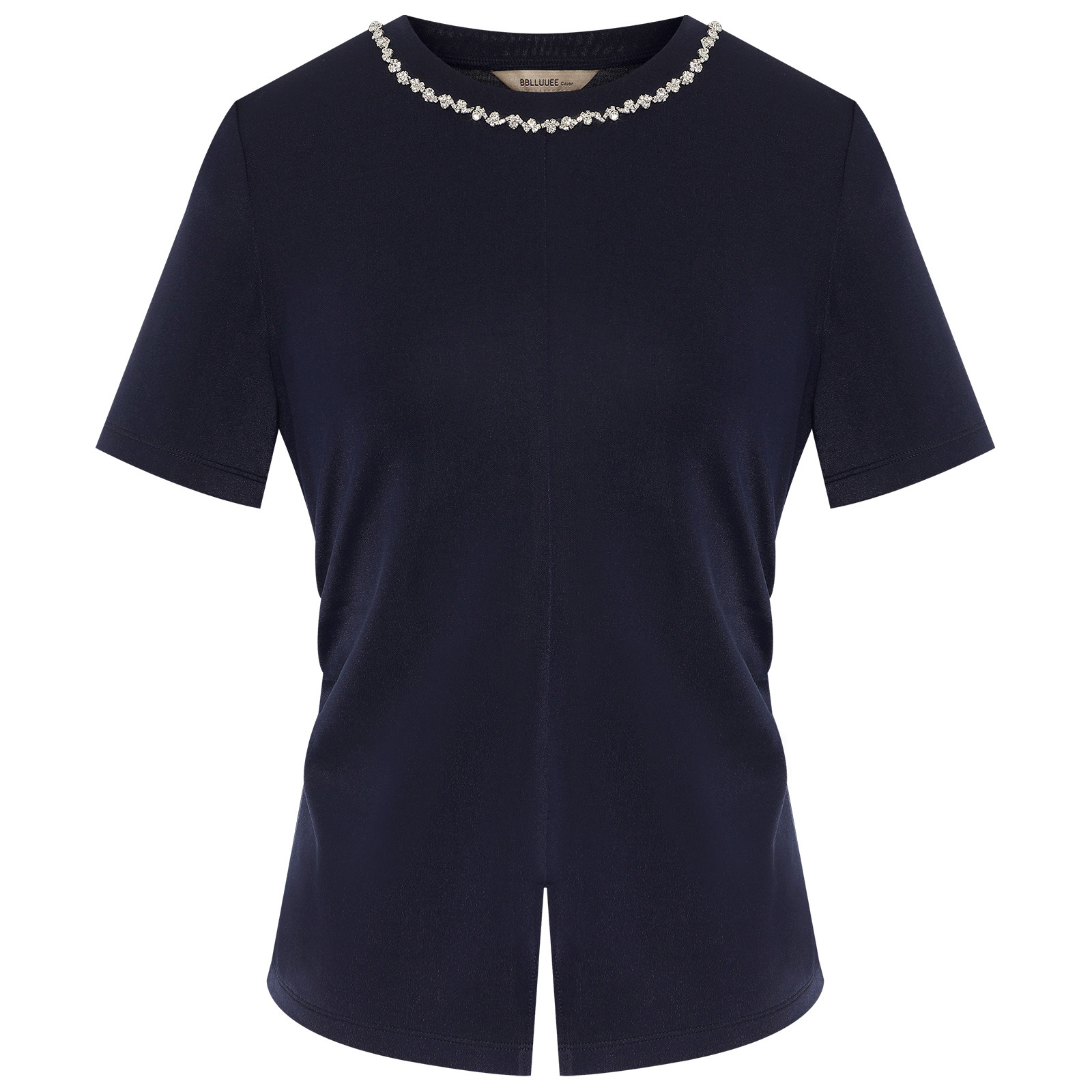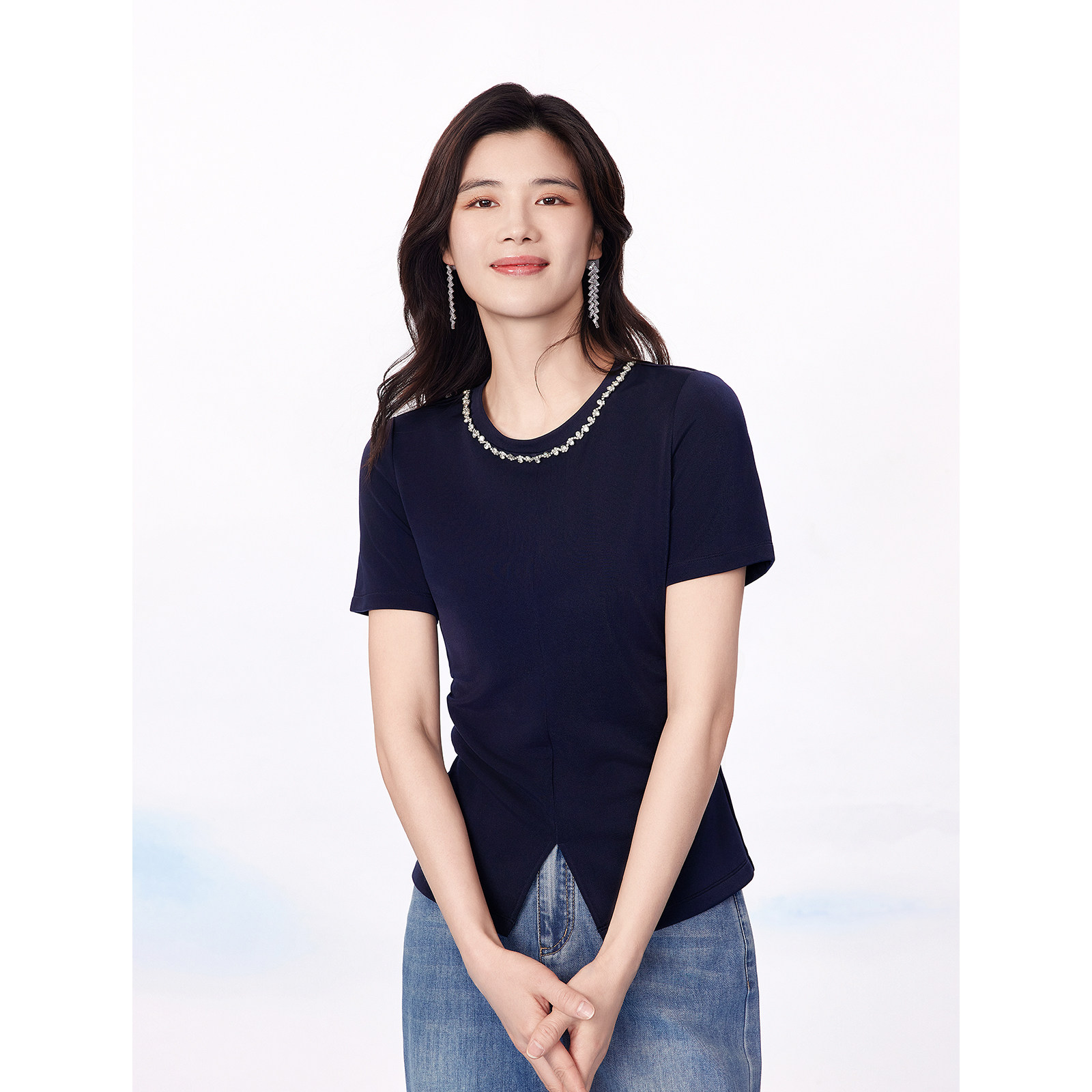 【松弛感】BBLLUUEE粉蓝衣橱2025夏新款闪钻捏褶开衩醋酸针织衫女