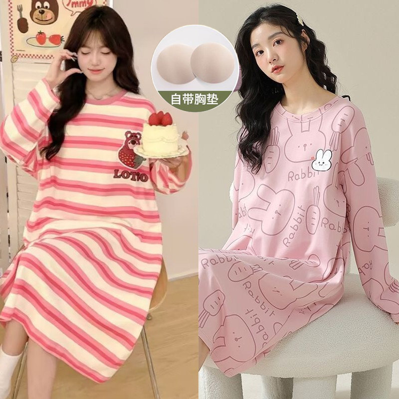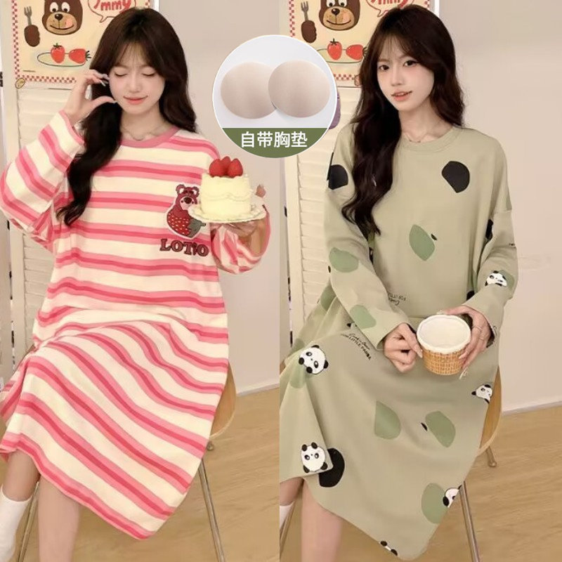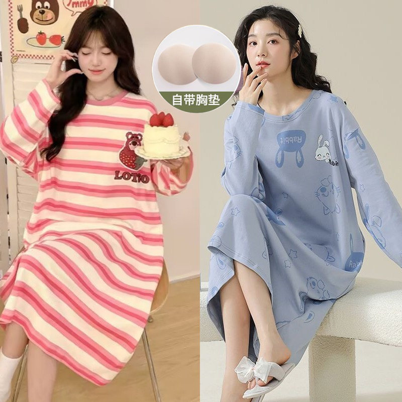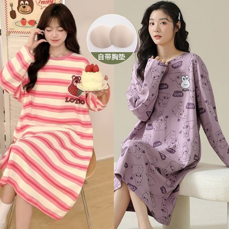 睡裙女夏款带胸垫长袖春秋季纯棉睡衣卡通学生长款连衣裙家居服