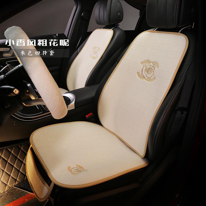 轻奢亚麻汽车坐垫四季通用冰丝棉麻小香风山茶花高级女神单片座套