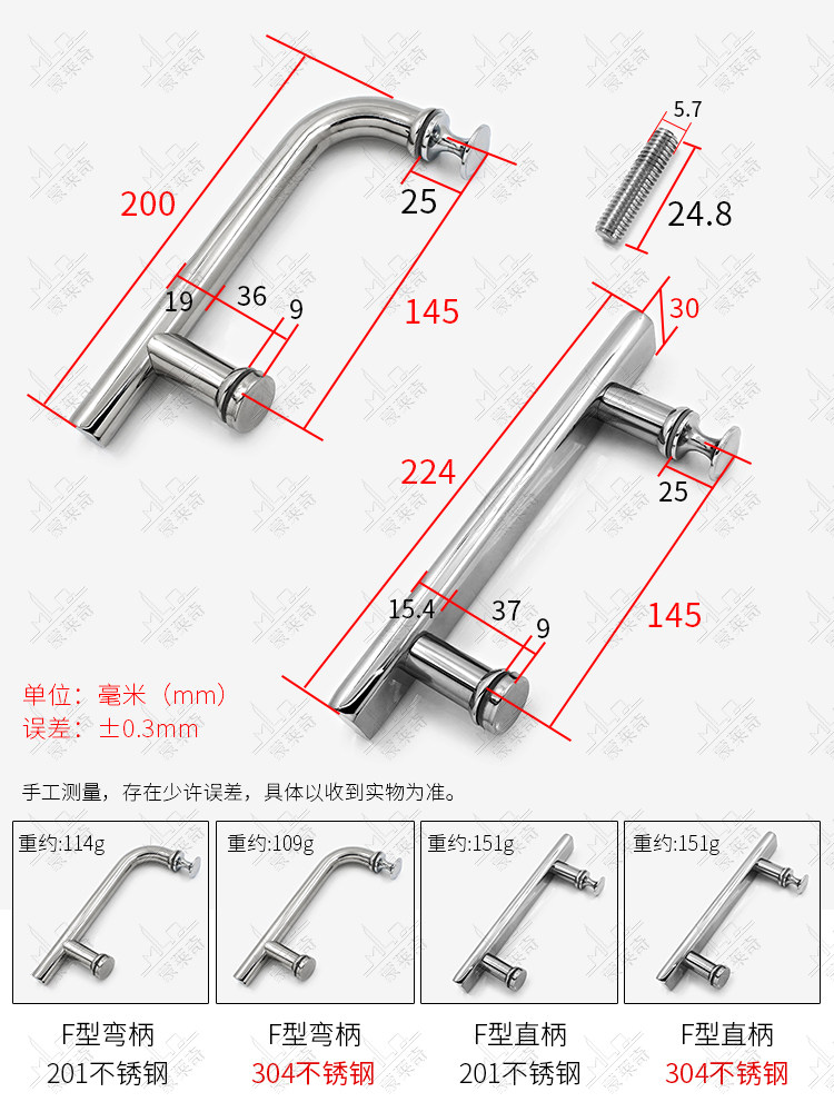加厚304不锈钢浴室玻璃门拉手卫生间推拉移门把手淋浴房门F型拉手