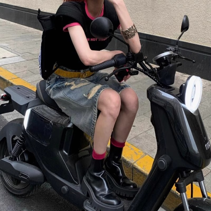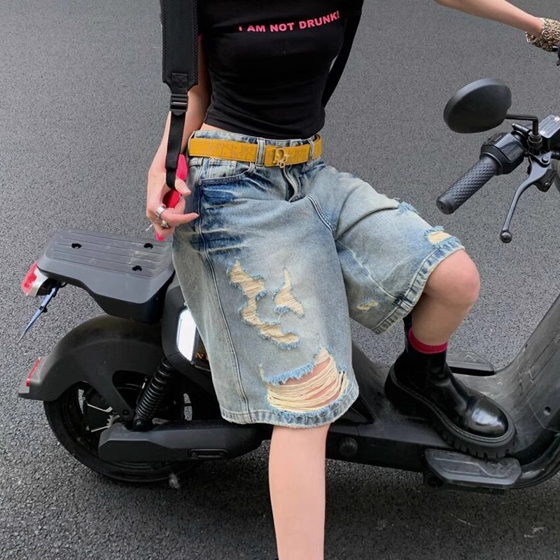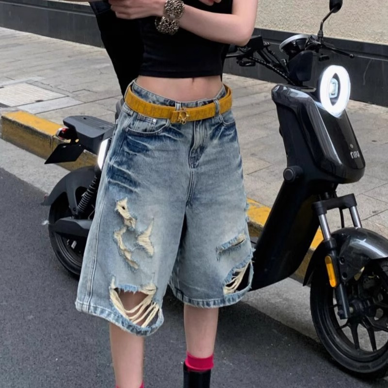 高腰破洞直筒牛仔中裤女夏季新款宽松大码胖mm做旧阔腿五分牛仔裤