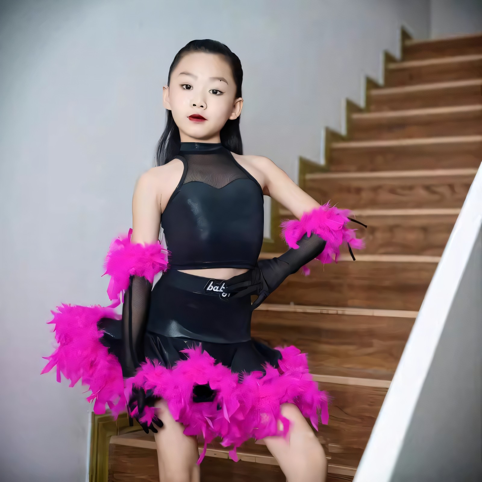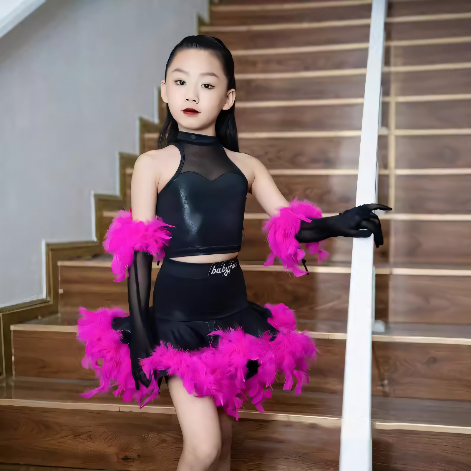 2026新款拉丁国标舞服女童团体表演服仿皮镂空上衣鸵鸟毛蓬蓬裙