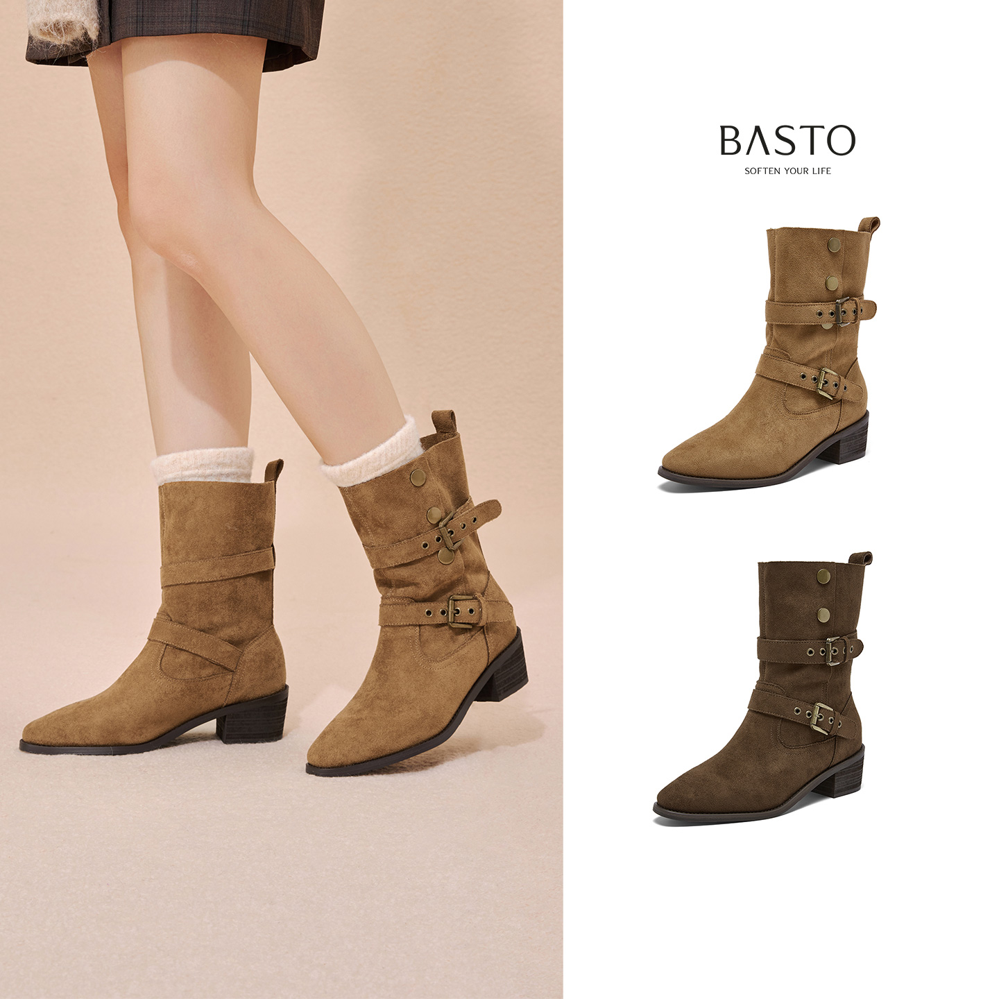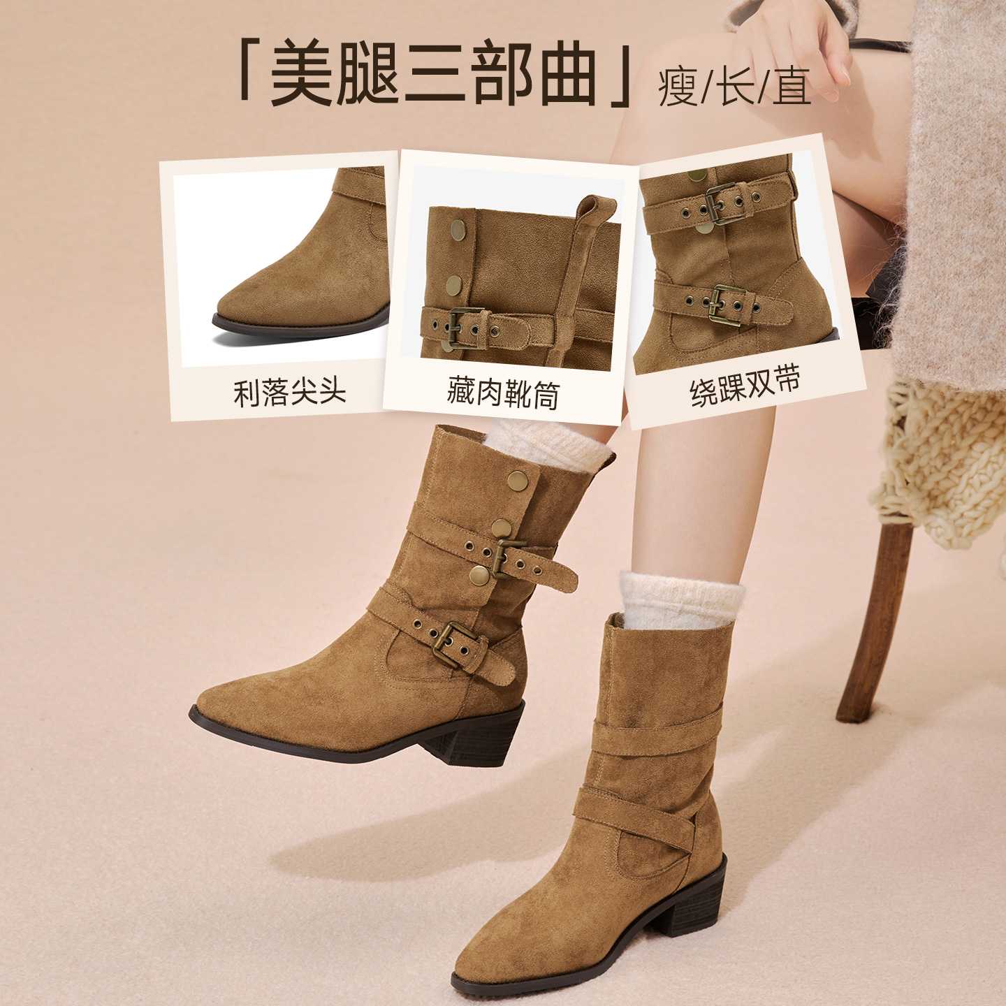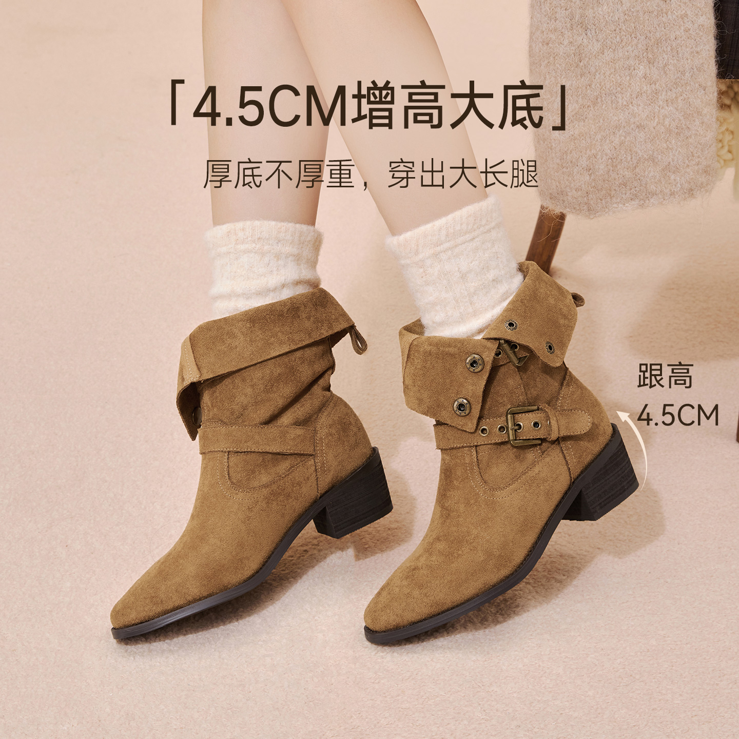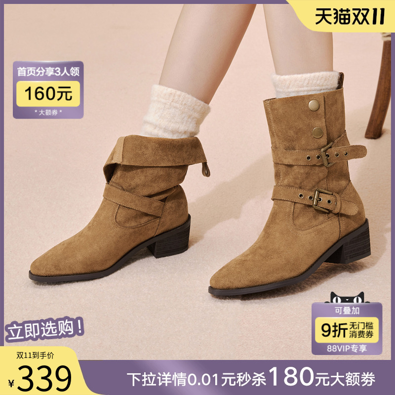 百思图2025冬季新款复古西部牛仔靴堆堆靴尖头粗跟女短靴BP019DZ5