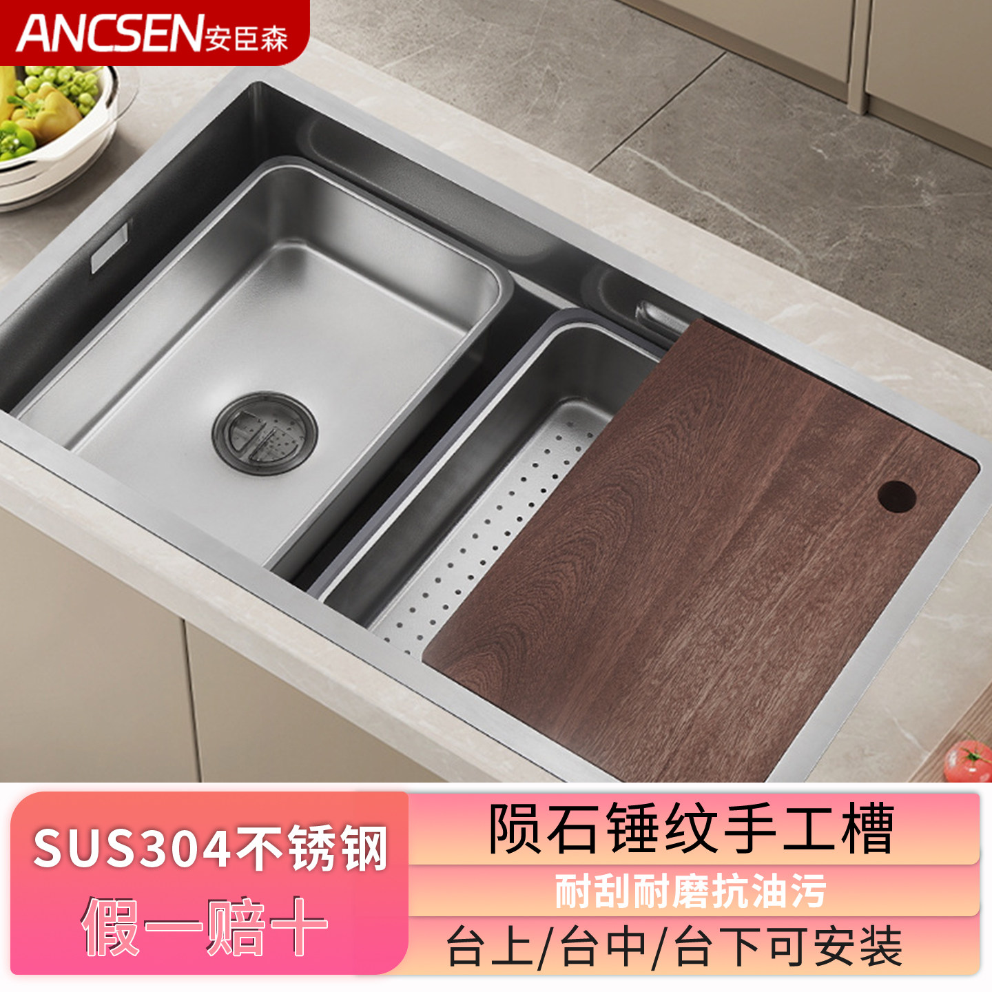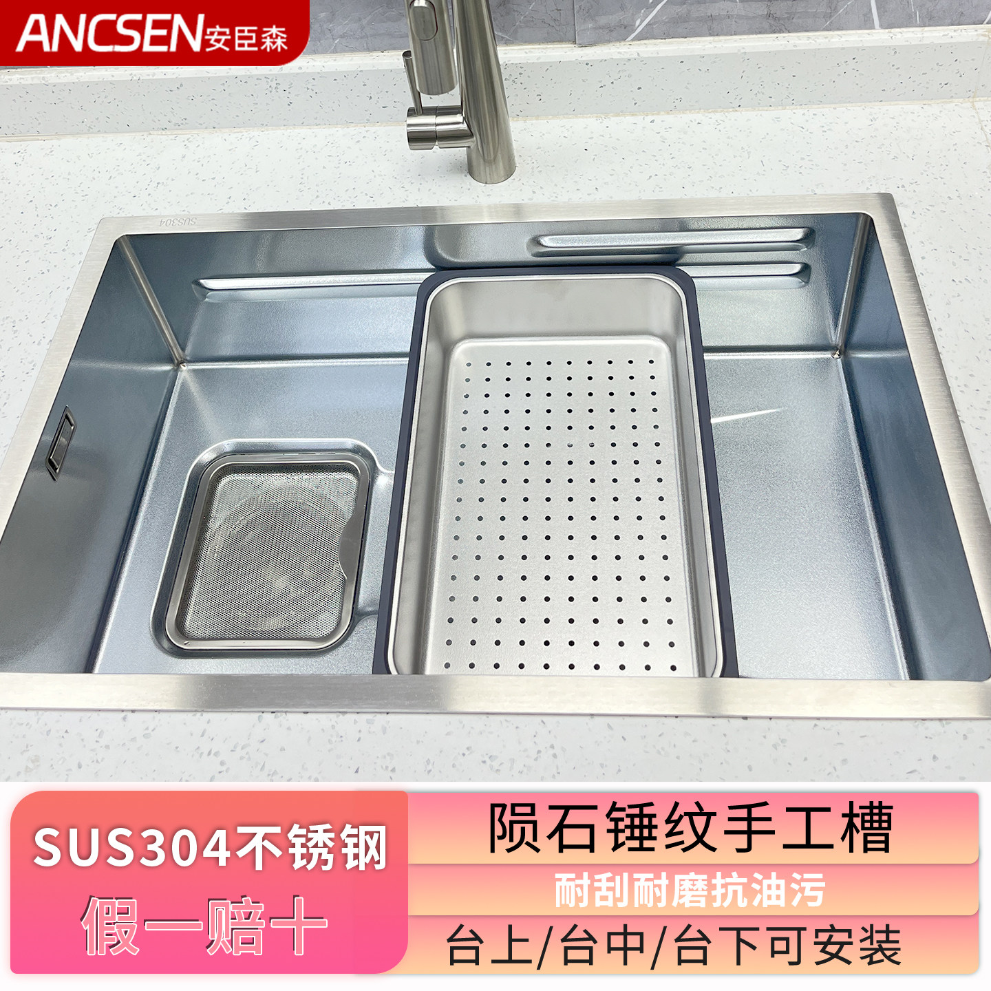 厨房SUS304不锈钢台控锤纹大单槽