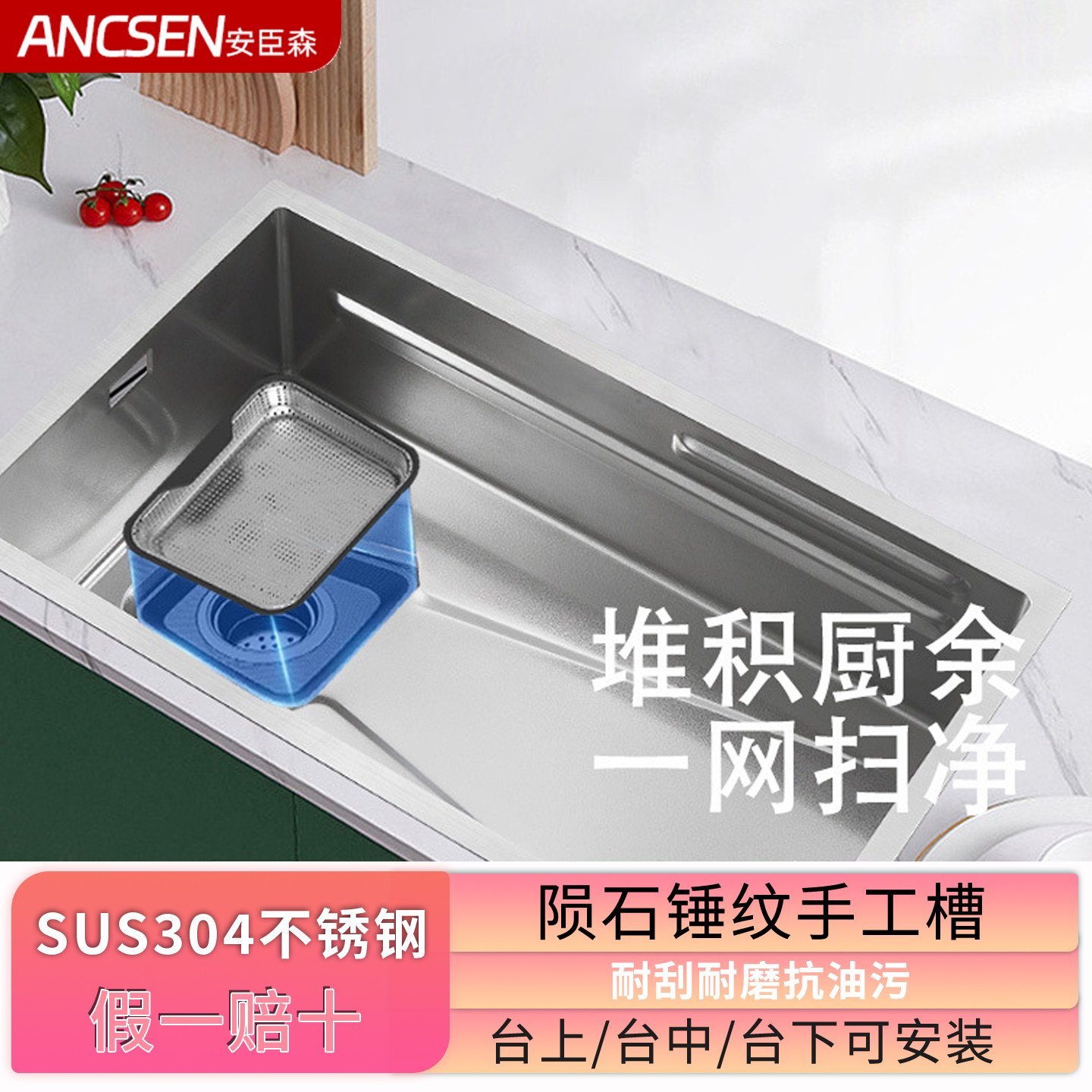 雪晶钢304不锈钢大单槽台控下水锤纹手工厨房水槽集渣大口径排水