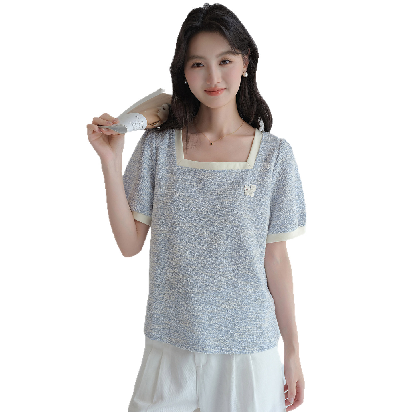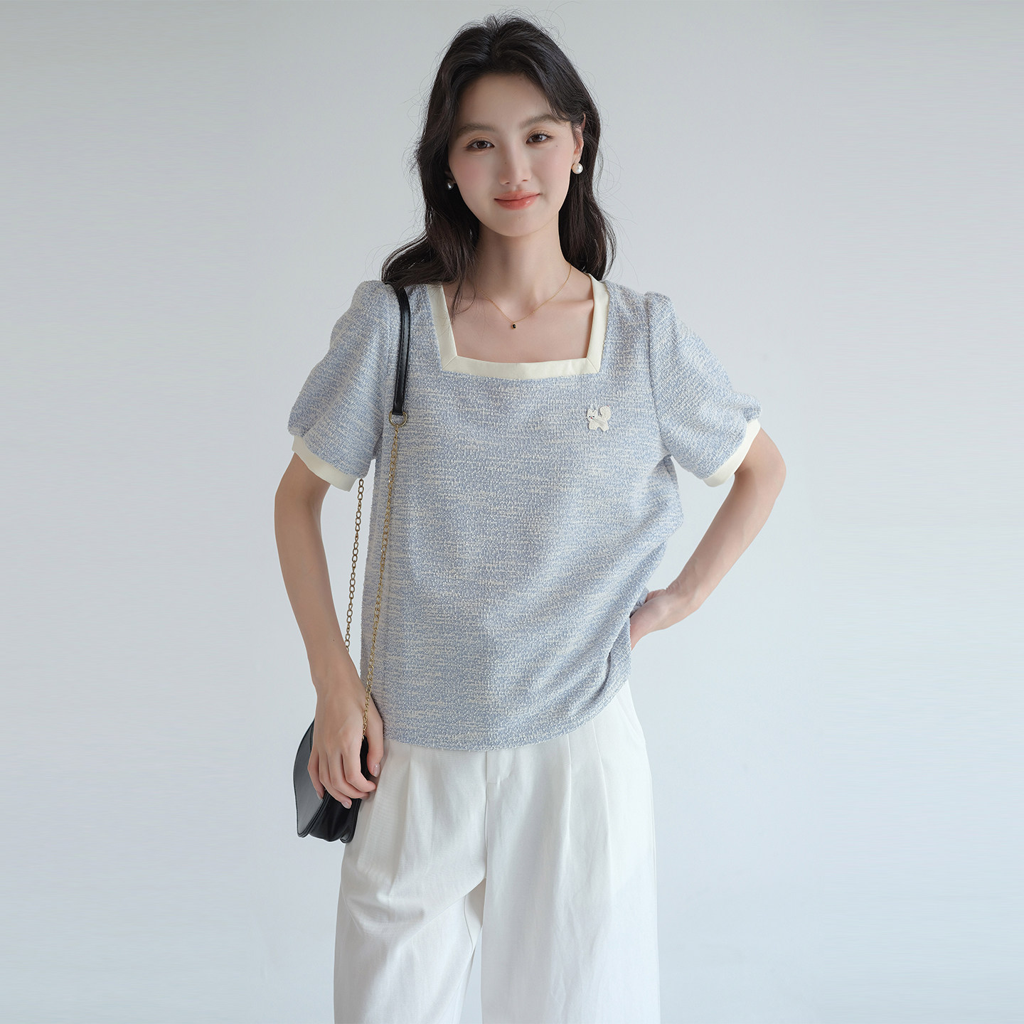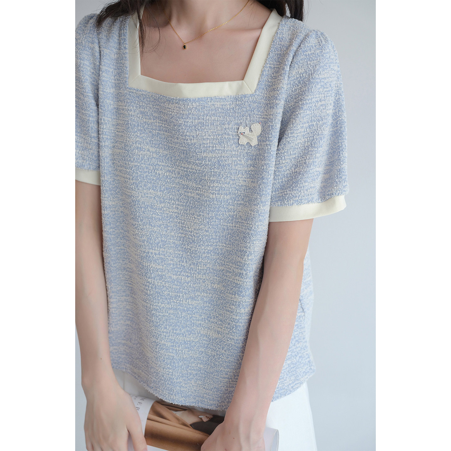 蓝若水法式方领短袖T恤宽松显瘦