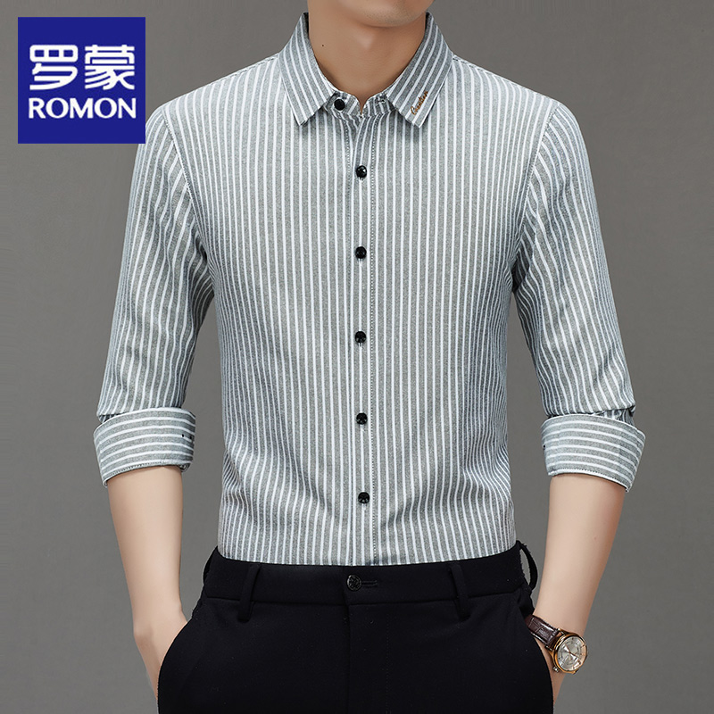 罗蒙竖条纹方领衬衫男长袖春秋款