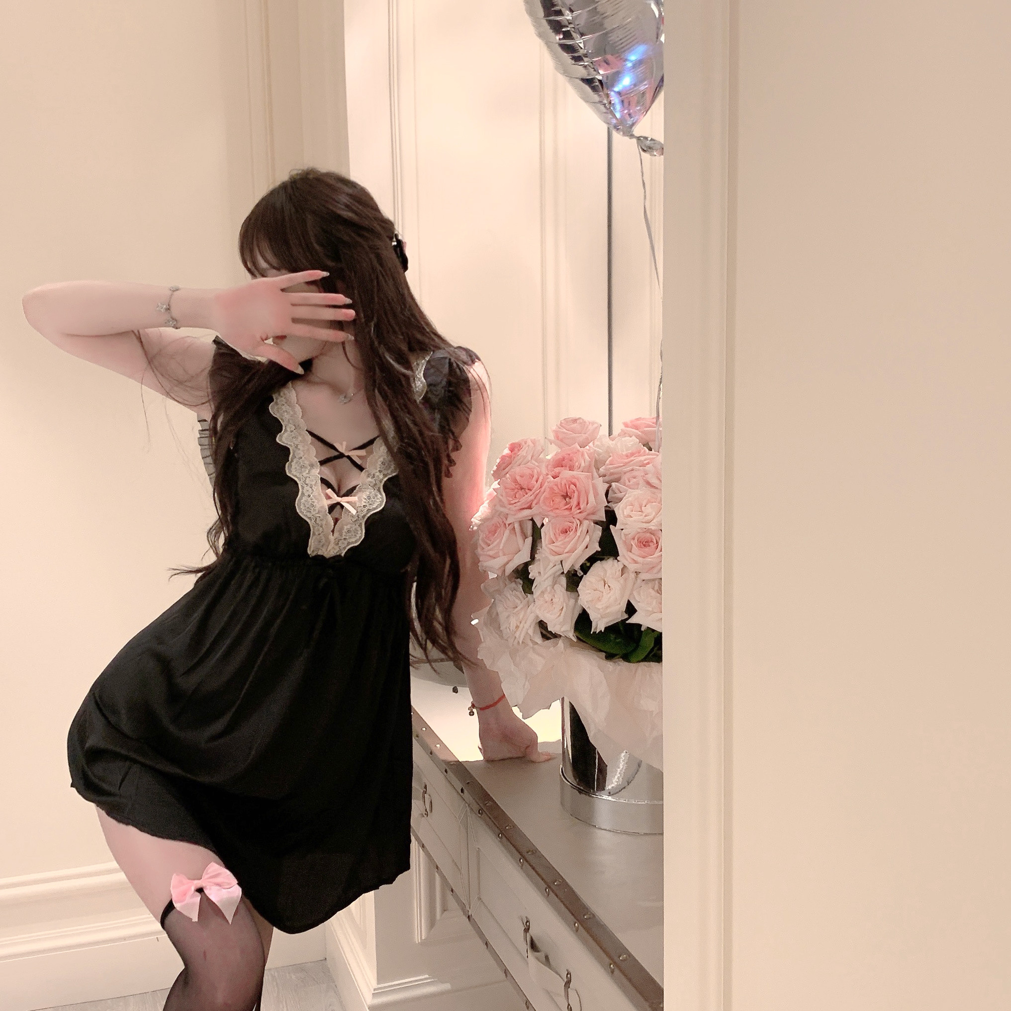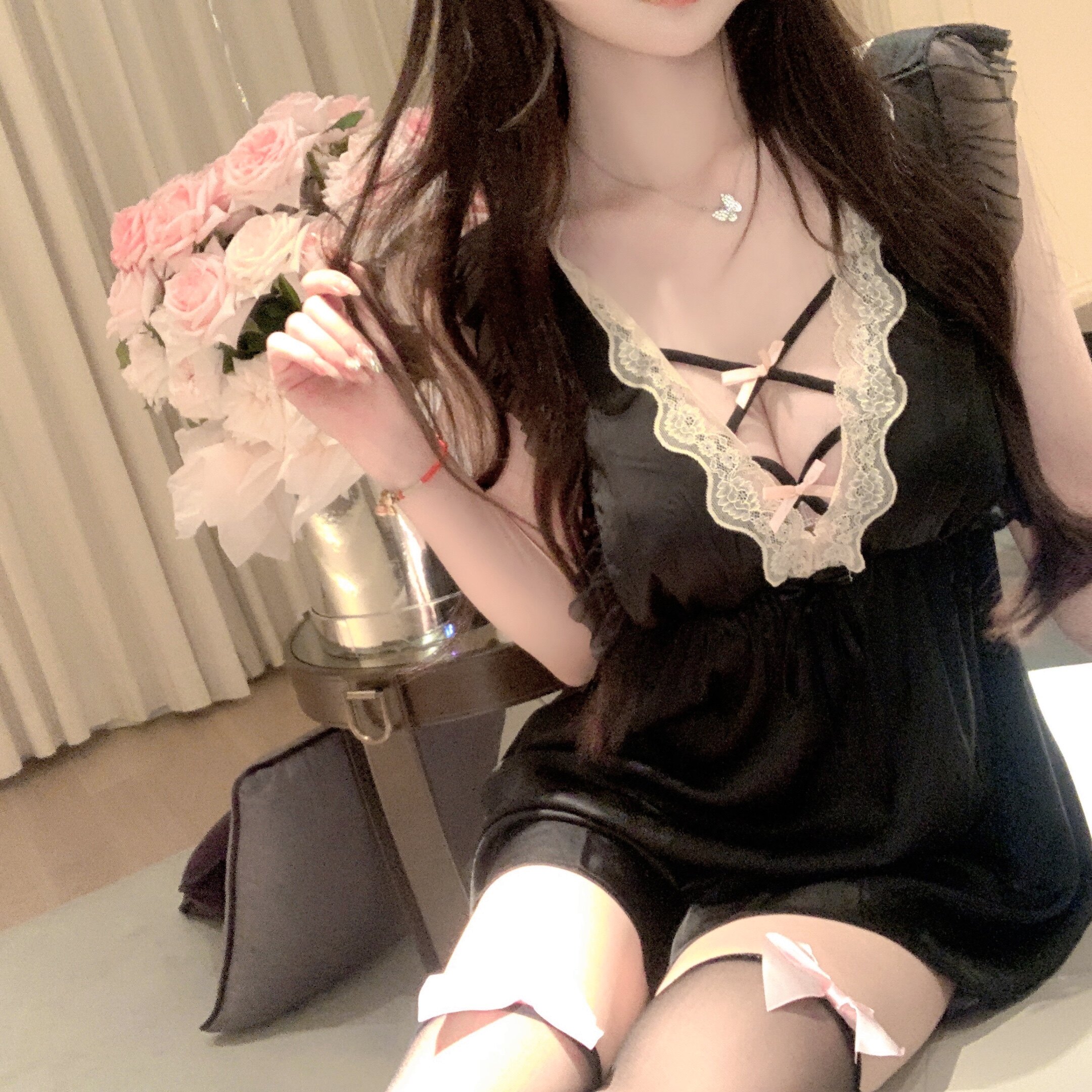 LaoLao酱「浪漫山茶花」纯欲性感蝴蝶结吊带睡裙女神显瘦私房新
