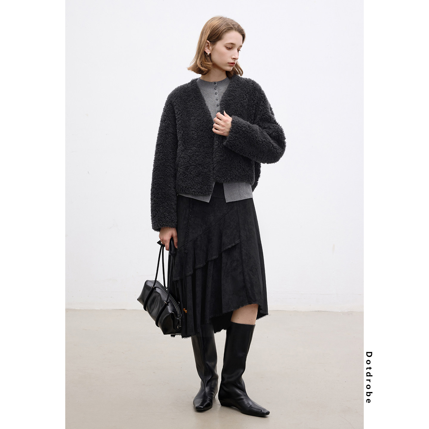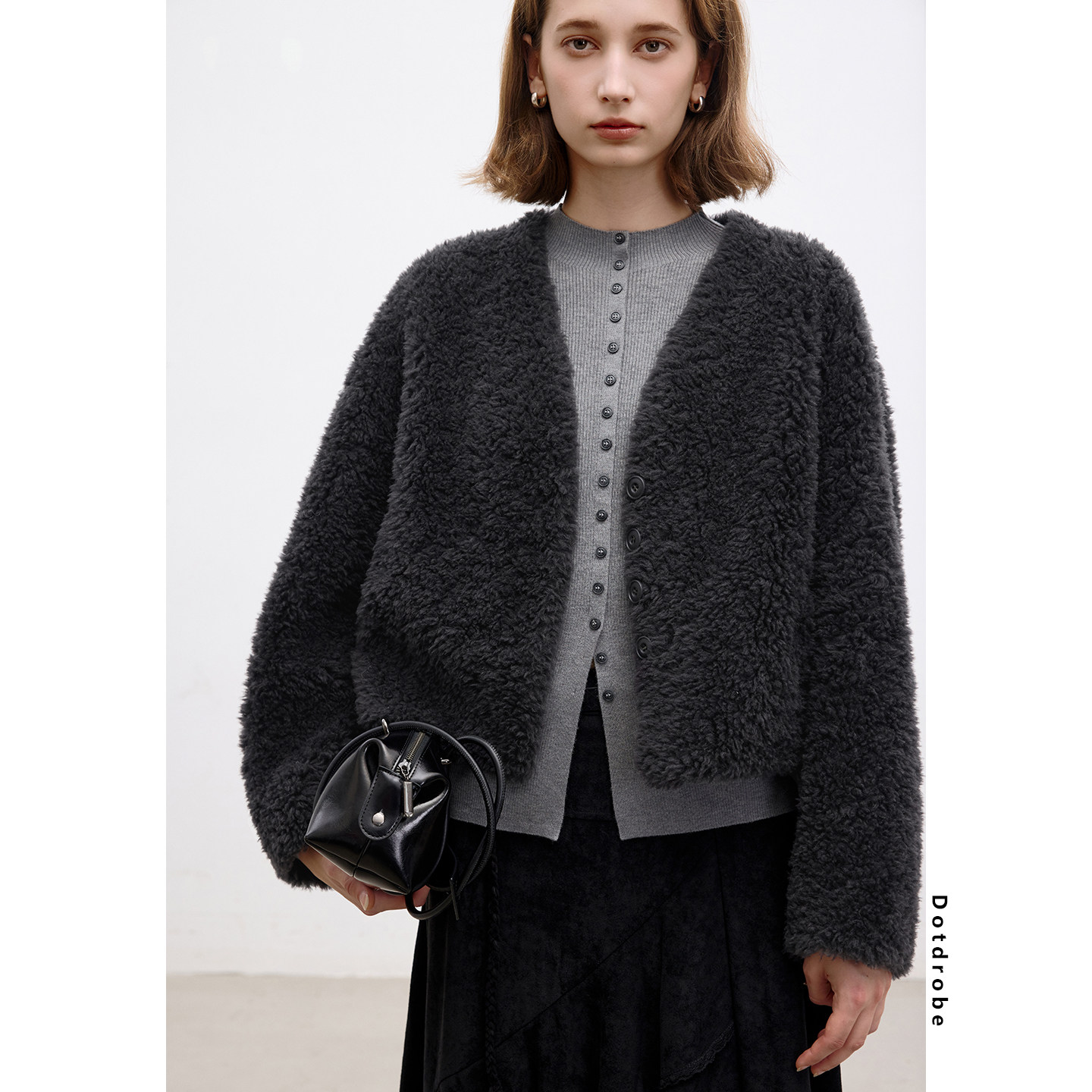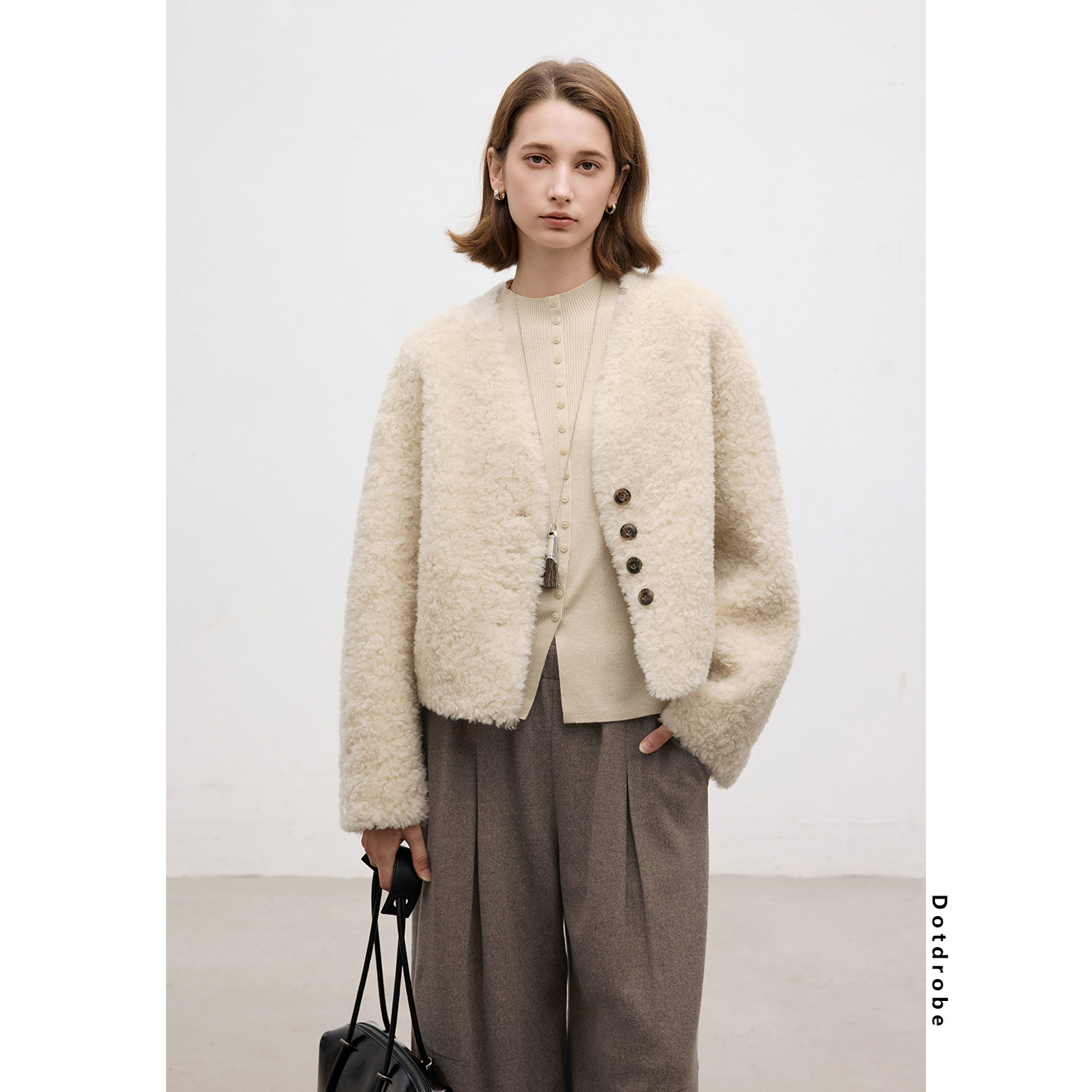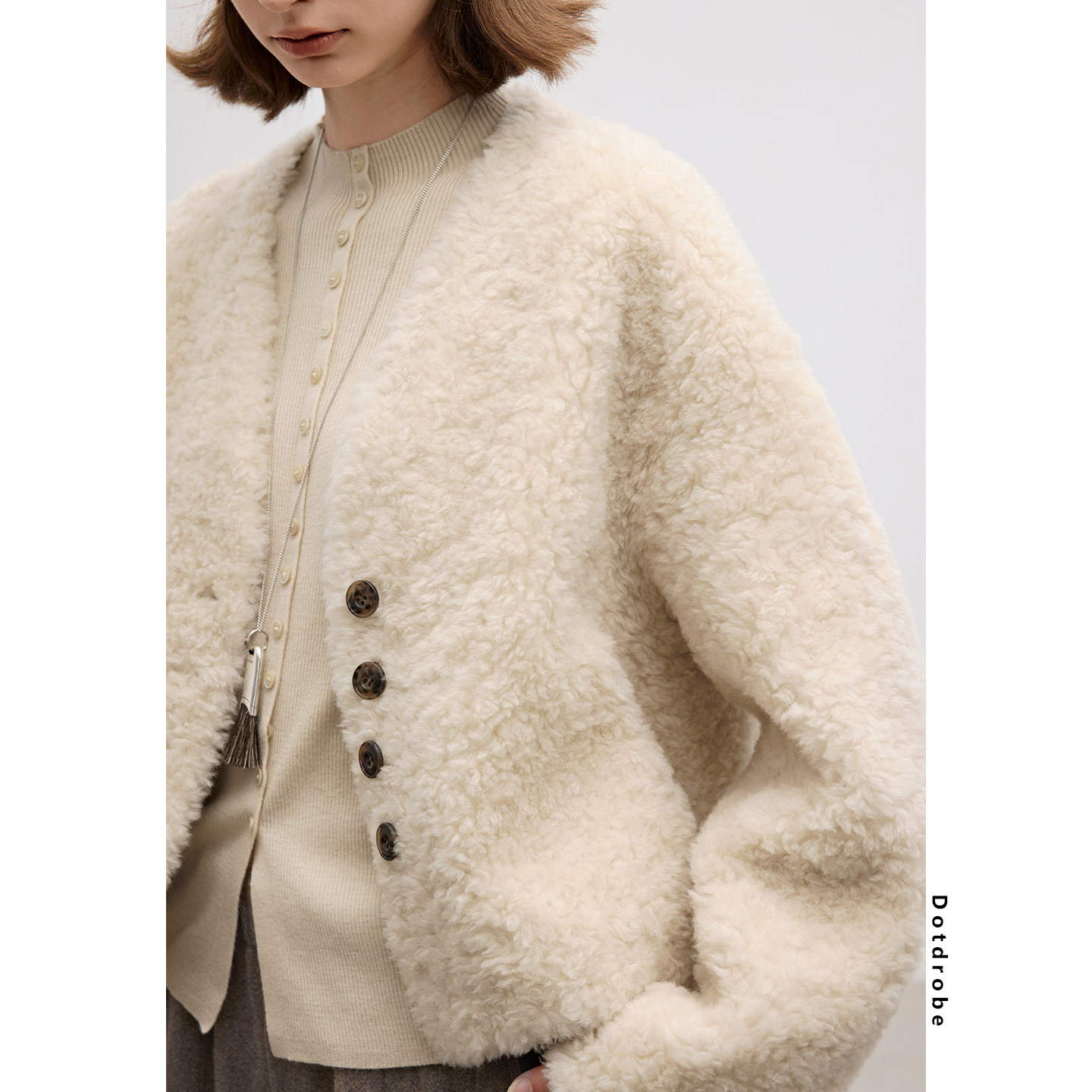 Dotdrobe多着 全羊毛 泰迪圈圈毛V领短款皮草外套女轻奢皮毛一体
