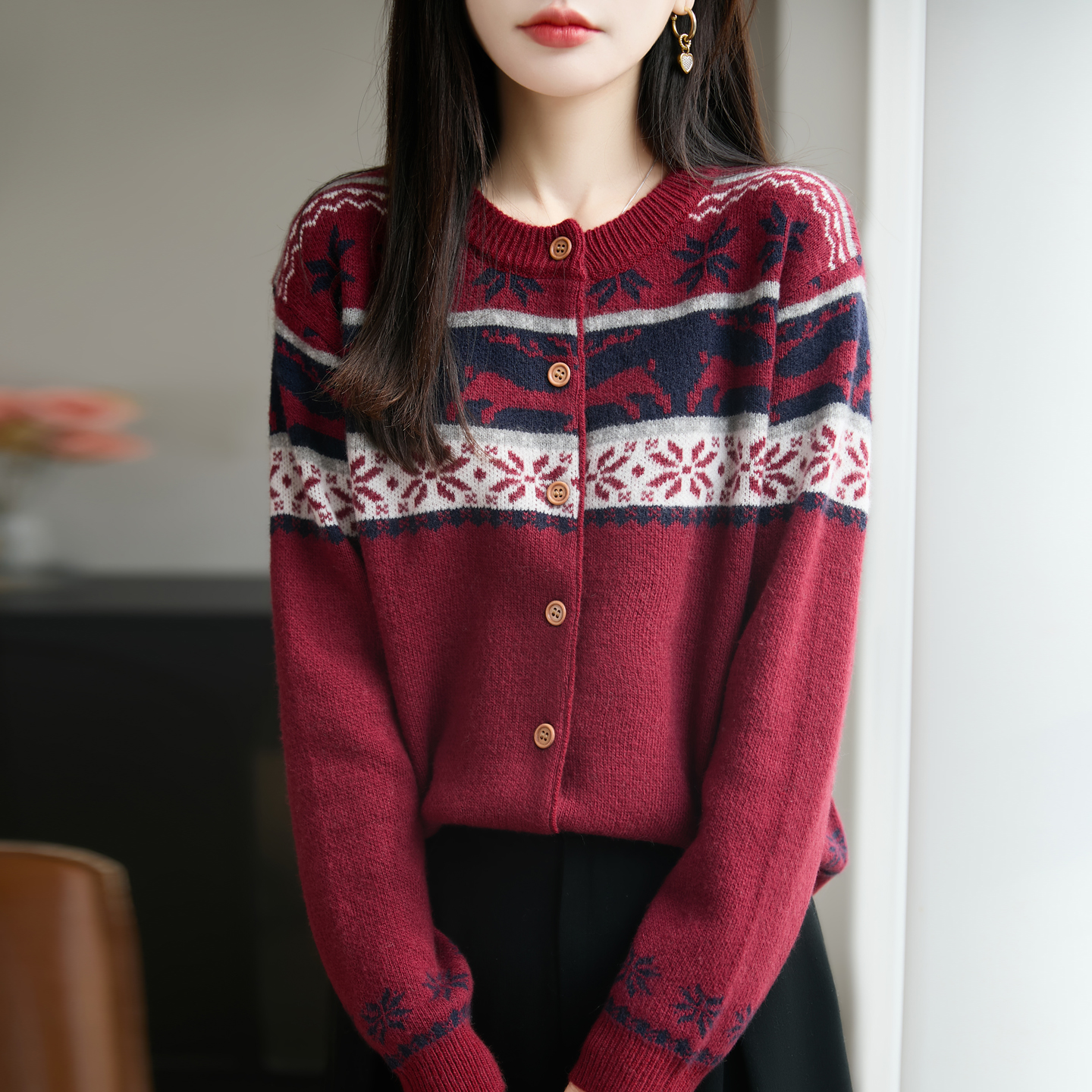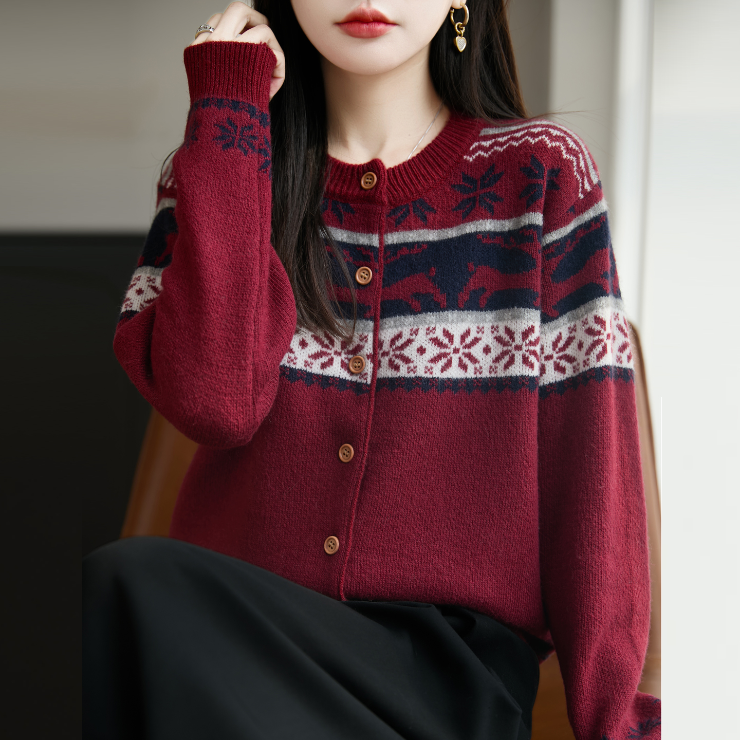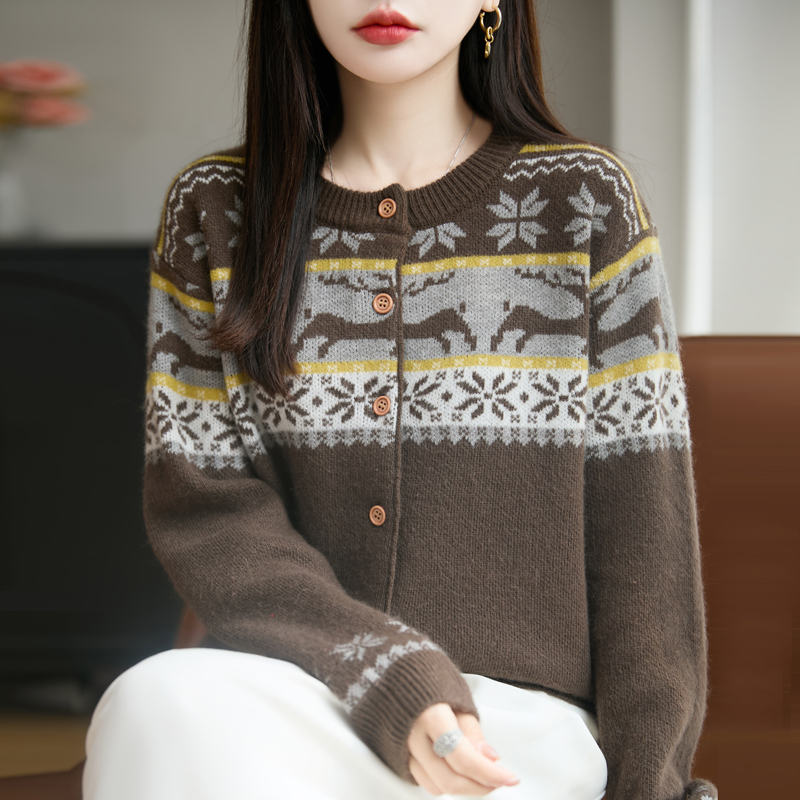 秋冬加厚精纺羊毛开衫女圆领复古拼色提花毛衣宽松提花外套羊毛衫