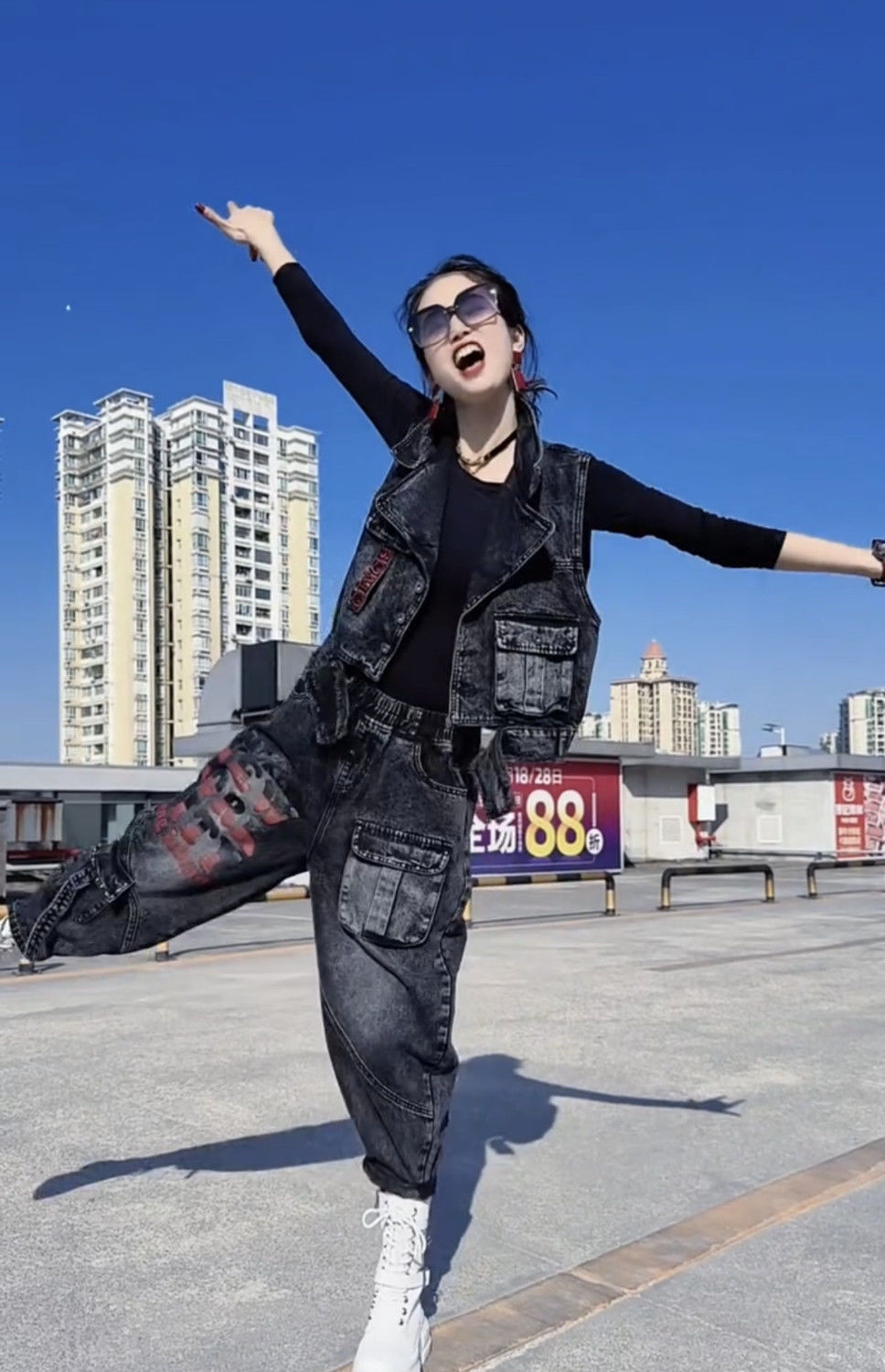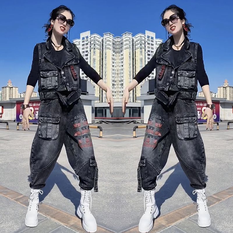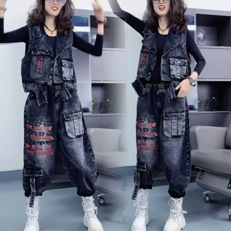 牛仔套装女欧货2025春秋新款休闲时尚宽松显瘦马甲哈伦裤三件套潮