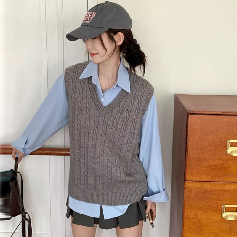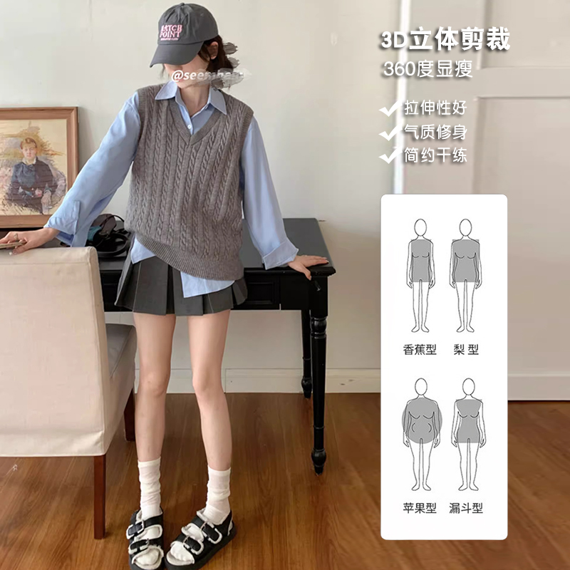 秋冬叠穿学院风蓝色衬衫灰色v领针织马甲套装大码内搭毛衣两件套
