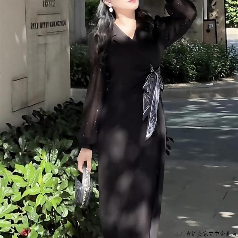 大码女装胖mm法式西装领收腰丝巾长袖连衣裙2025秋季显瘦气质裙子