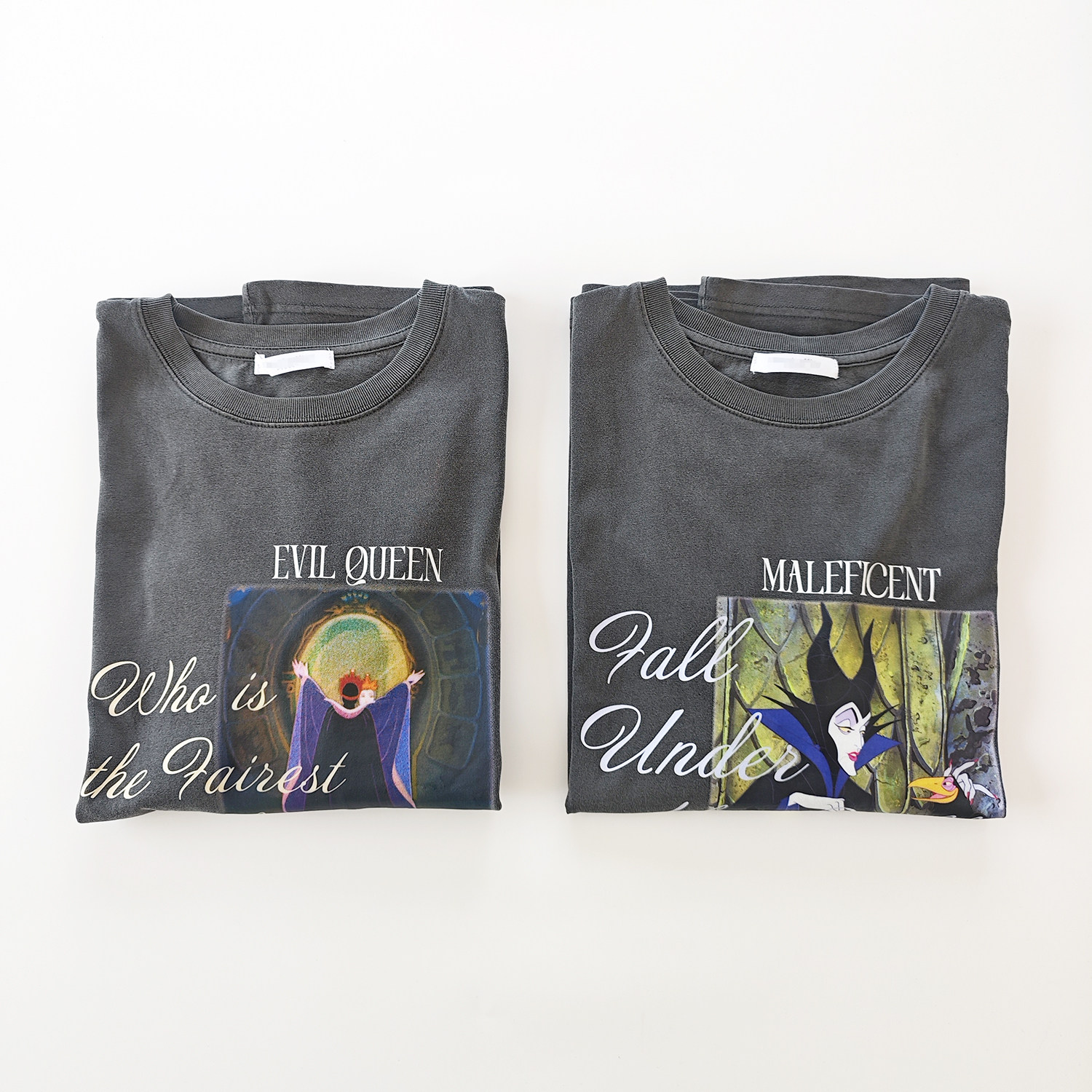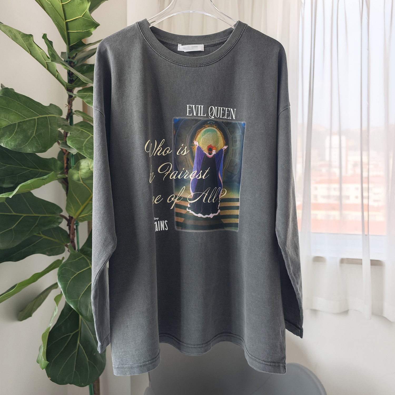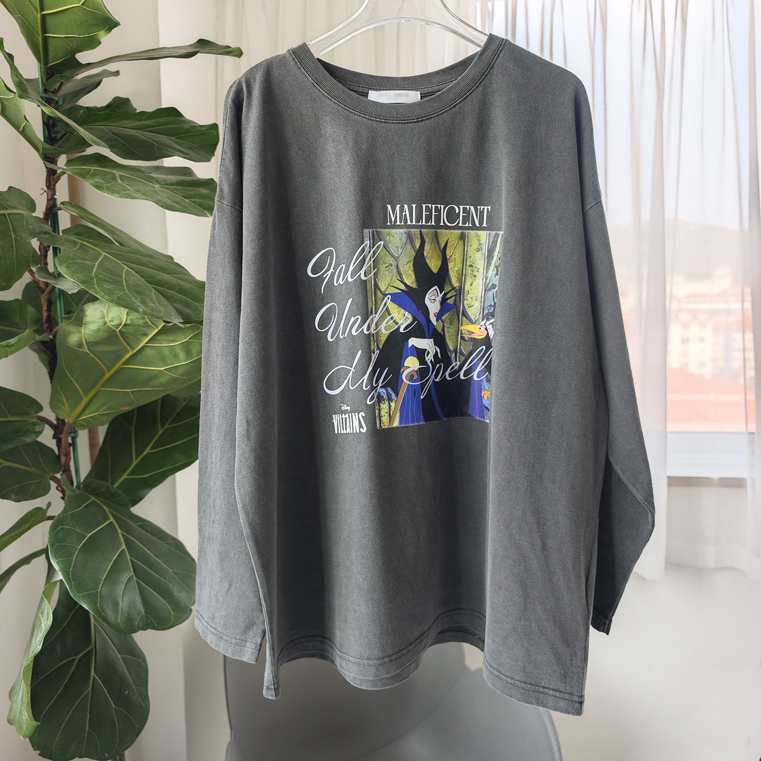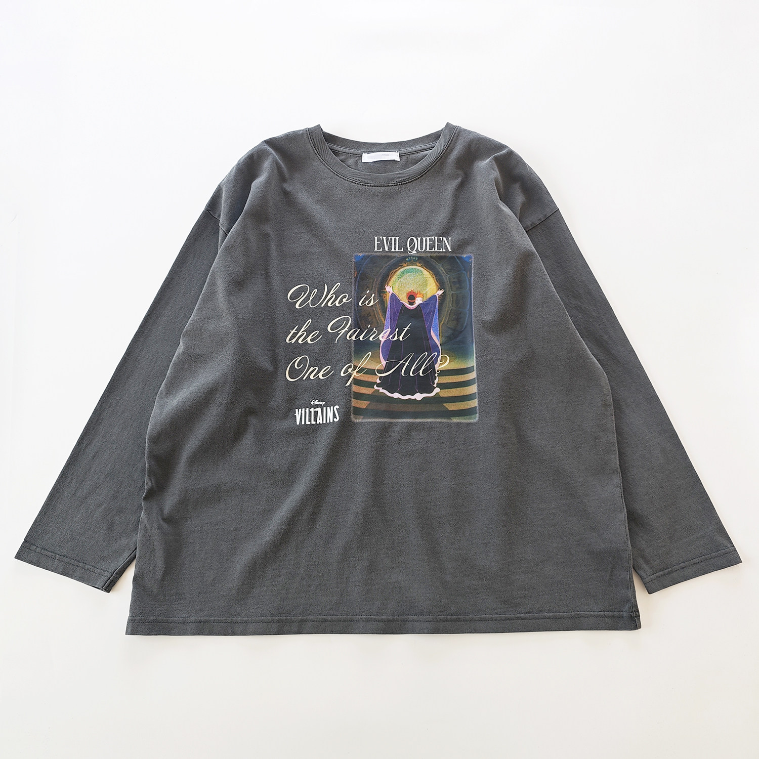 日单日系水洗深灰色复古纯棉女巫卡通字母印花长袖T恤小衫上衣女