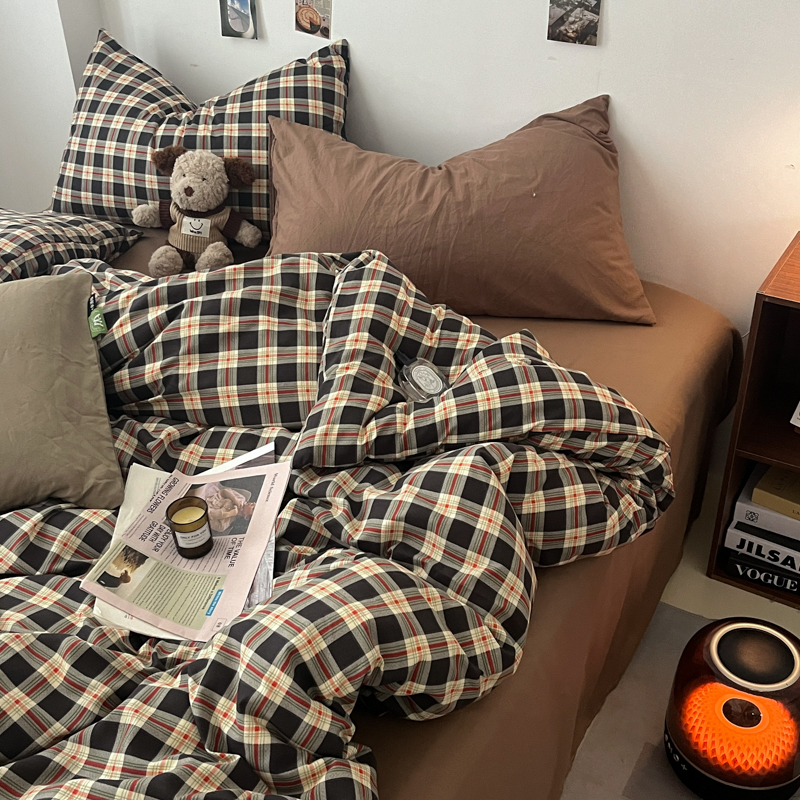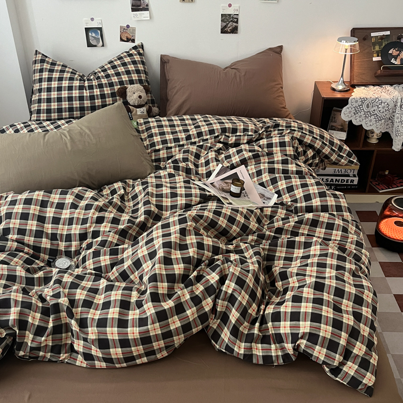 英伦风复古格子床上四件套黑色高级感水洗非全棉纯棉被套床单床品
