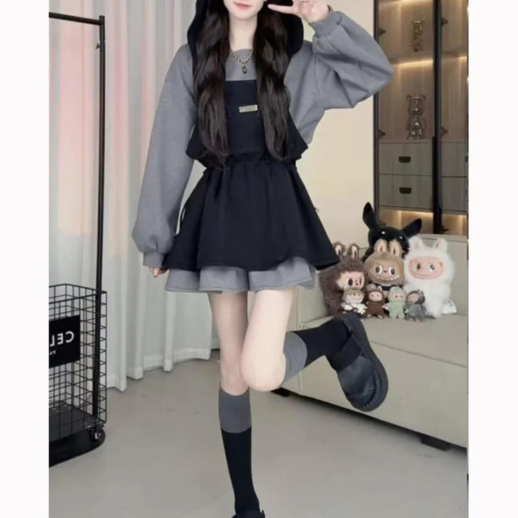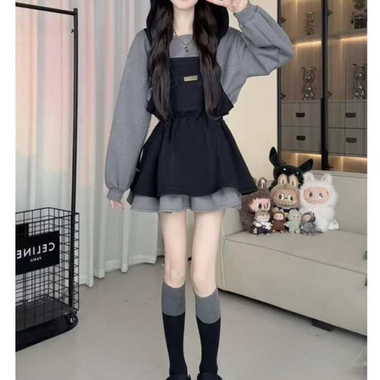 韩系设计感小众套装女秋季新款宽松圆领卫衣收腰背带短裙两件套