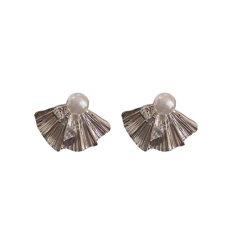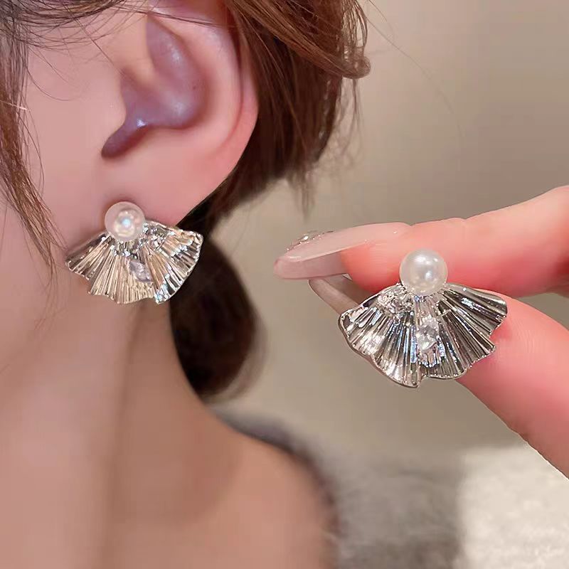 高级金属感镶钻扇子珍珠925银针耳钉简约甜美小巧气质网红耳环女