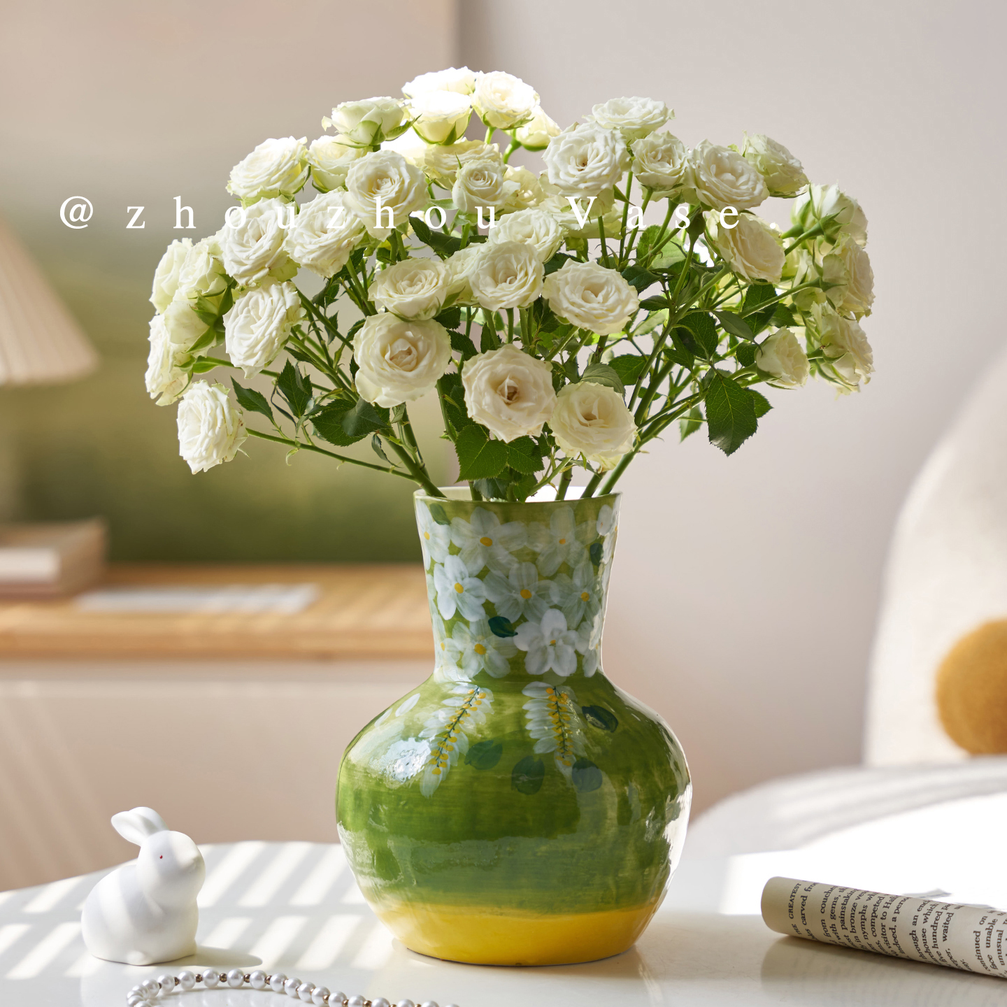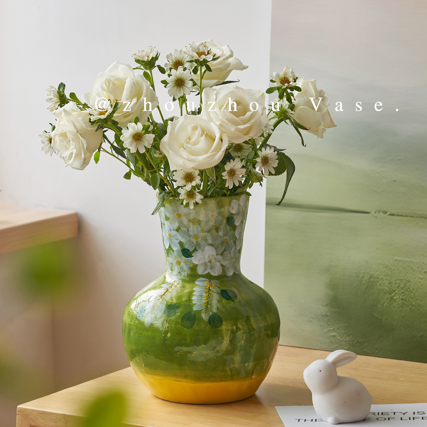 周周家手绘陶瓷釉下彩花瓶客厅插花高级感干花摆件绿色小清新花器